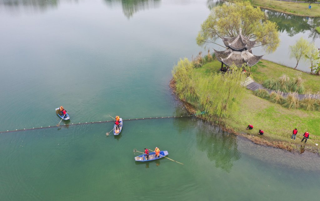 志愿者正在眉山市东坡城市湿地清理水面漂浮物和捡拾垃圾。姚永亮 摄(C视觉)