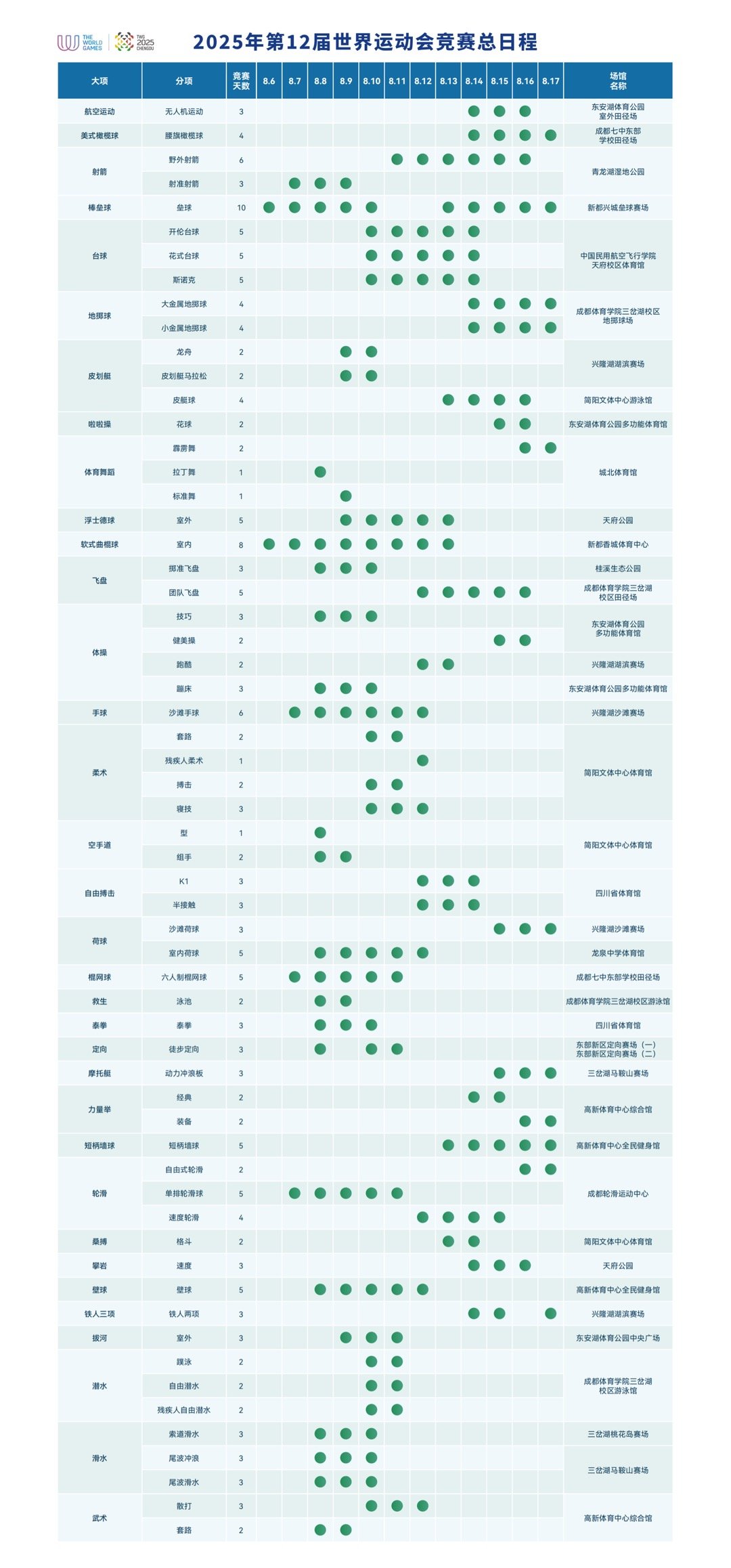 将于今年8月7日至17日举行的成都世运会,共设34个大项、60个分项。其中蹦床、攀岩、腰旗橄榄球、垒球、棍网球、壁球等项目为2028年洛杉矶奥运会正式比赛项目。
