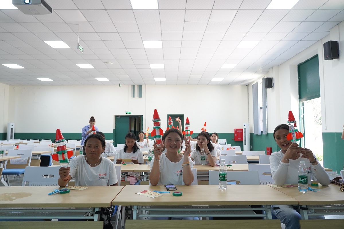 科学实践课上,同学高兴地展示制作好的“火箭”