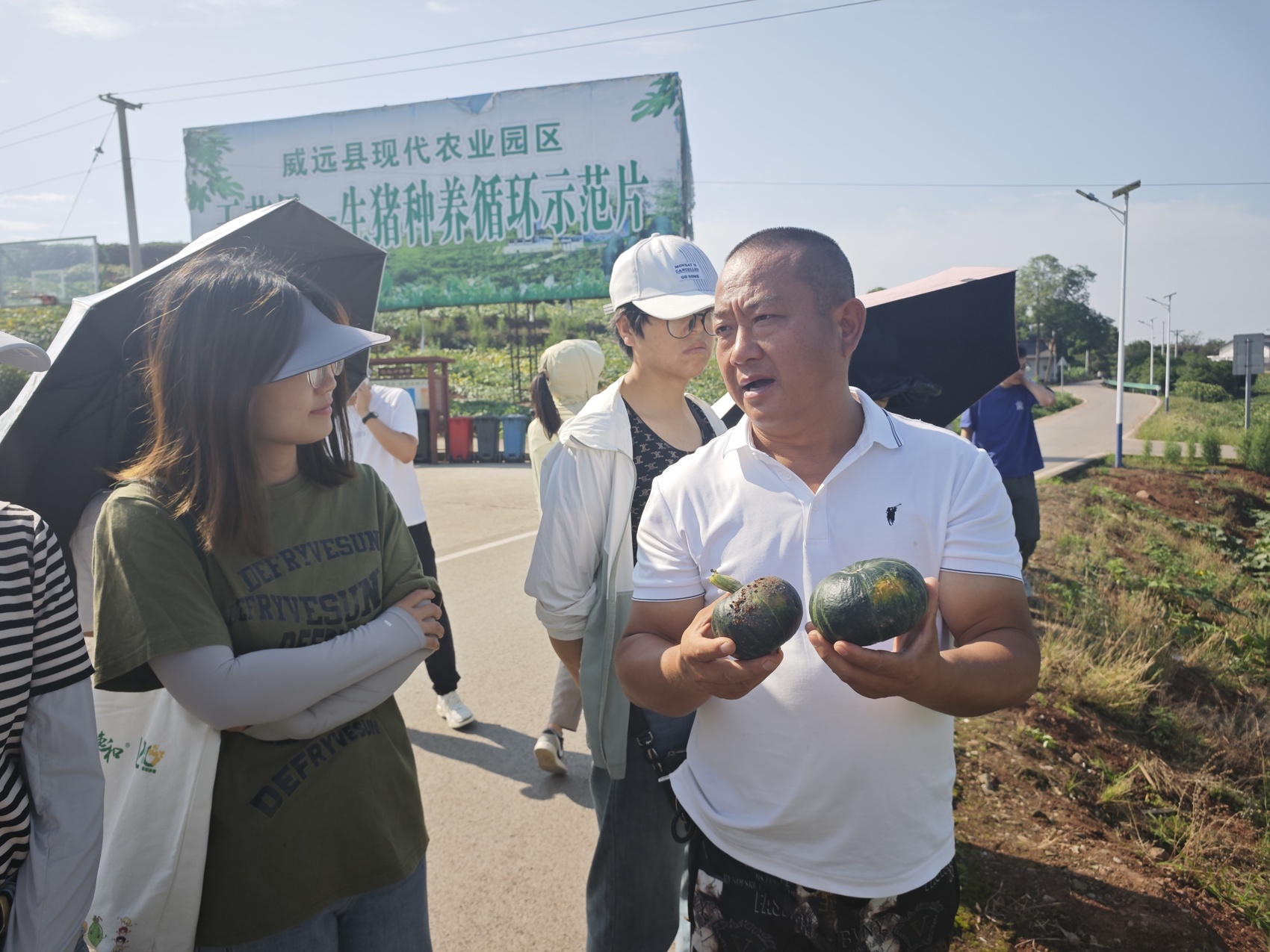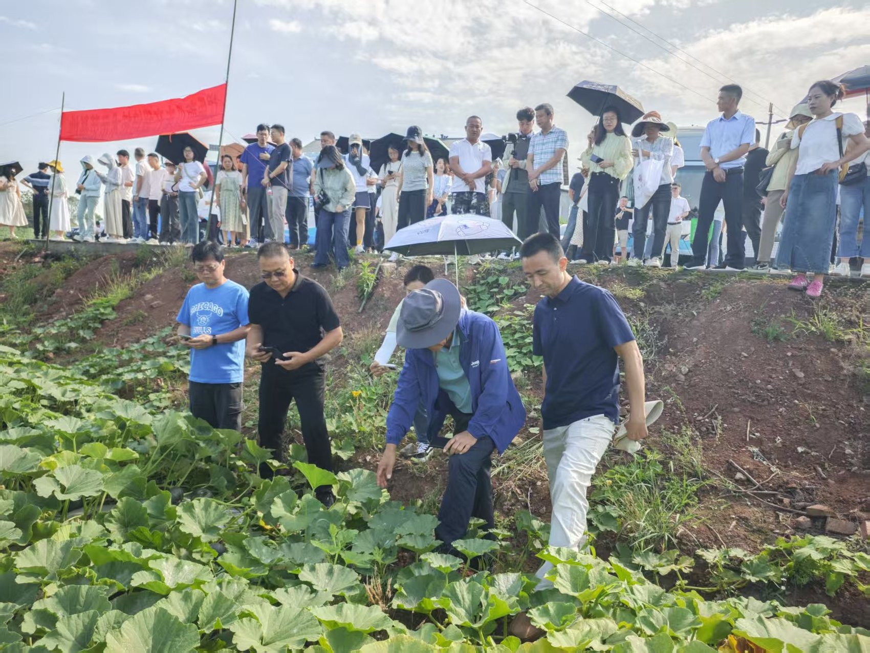 与会人员在威远县镇西镇参观南瓜种植基地。