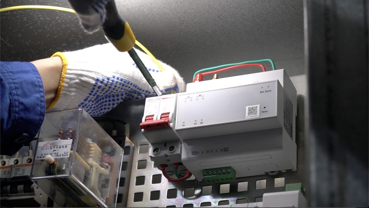 国网资阳供电公司作业人员在企业安装虚拟电厂智慧能源监测终端。