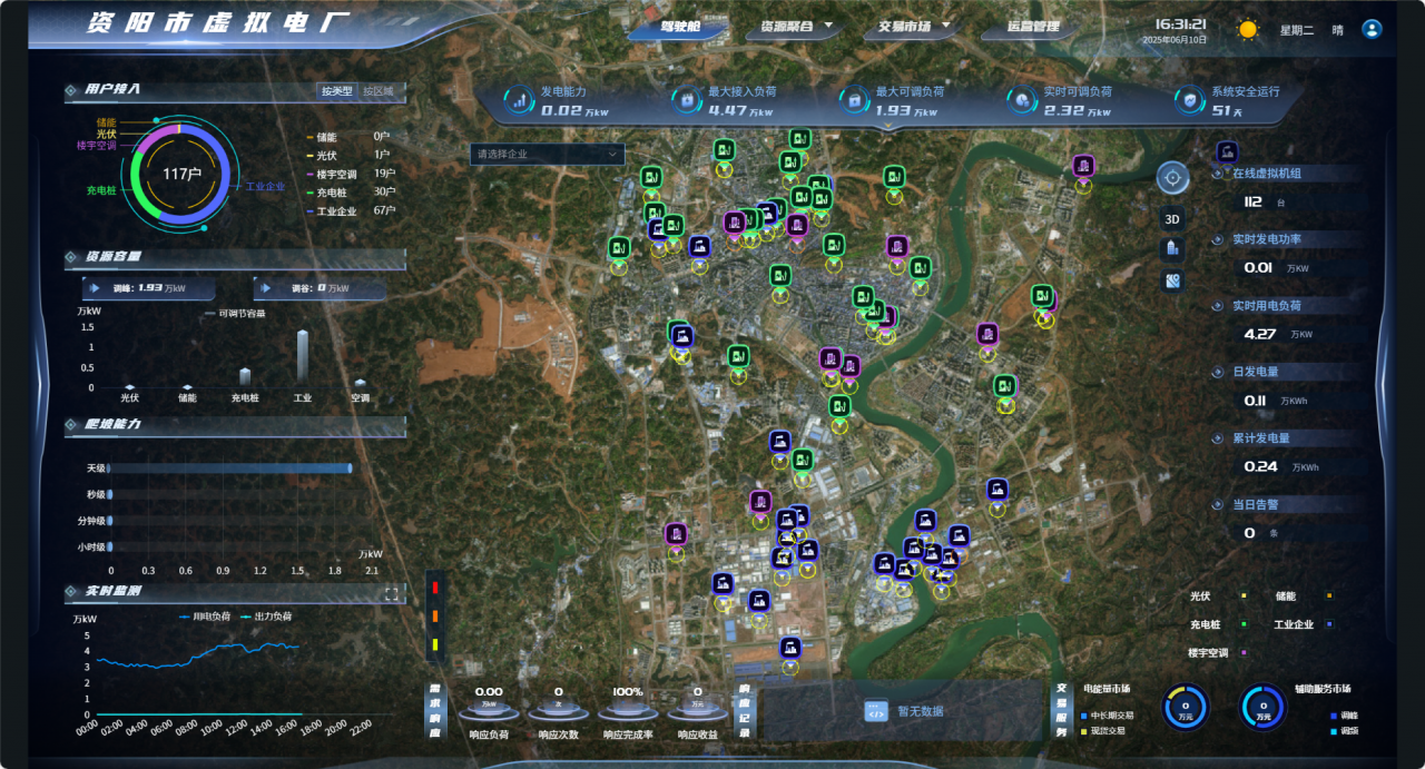 韩俊口中的“智慧管家”,正是资阳市在全省率先探索上线的“政府兜底型”虚拟电厂。这个看不见的“电厂”,并非传统意义的发电设施,而是依托先进信息通信和数字化技术,巧妙聚合企业、楼宇、充电桩、分布式电源(如屋顶光伏)、储能设施等分散的电力资源,形成一个可智能响应、灵活调节的“能源大脑”。其核心在于政府主导、全额出资、兜底保障,企业“零投入”即可接入,共享改革红利。
