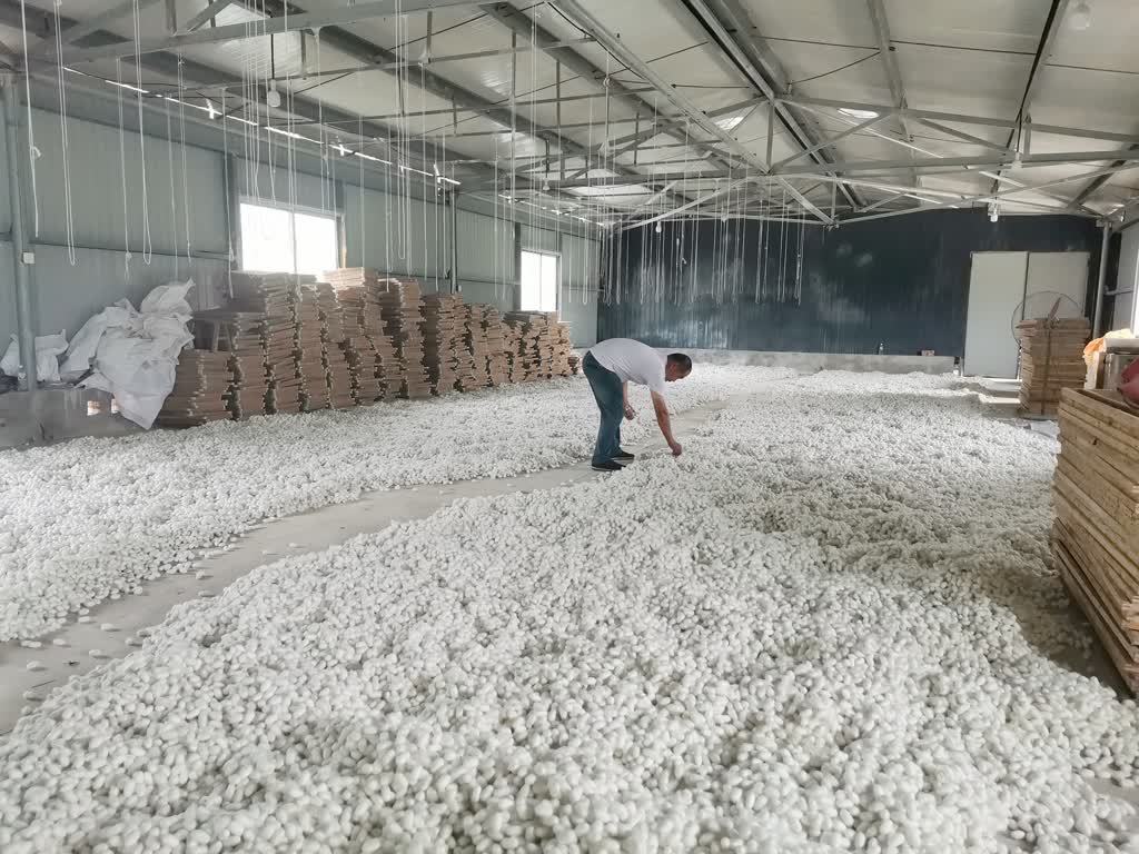 盐泉镇玉溪村蚕桑产业园的收茧室里也是一派繁忙景象,形状饱满、颜色洁白的蚕茧被工人们从方格簇上取下来。玉溪村村民不仅自己养蚕卖茧,还会到蚕桑产业园帮忙摘茧。蚕桑产业园今年招纳了40余名村民来摘茧,预计发放工资6万元。