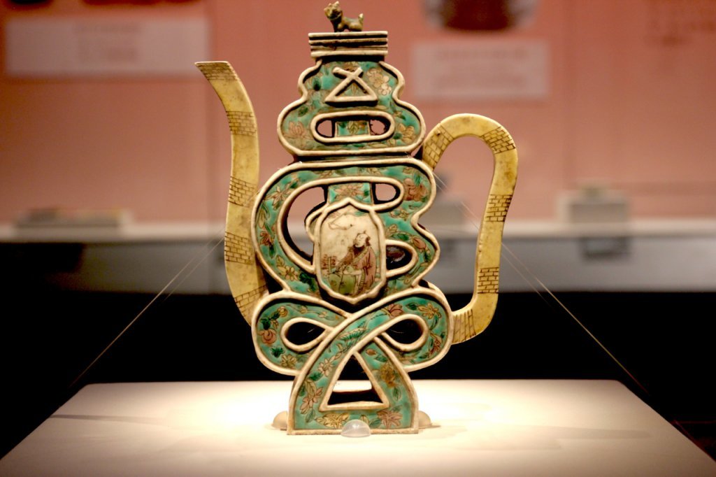 此次展览的文物类型多样,不仅有瓷器,还有金银器、玉器、漆器、织物等。其中,现代嵌宝铜鎏金珐琅彩太平有象摆件,寄寓“天下太平”之愿;清五彩人物纹寿字形瓷执壶,以寿字为造型,造型别致、做工精良;民国漆地描金双龙戏宝纹塔式木罐,尽显精湛漆艺;现代红缎绣云龙纹披肩,尽展民族服饰之美。