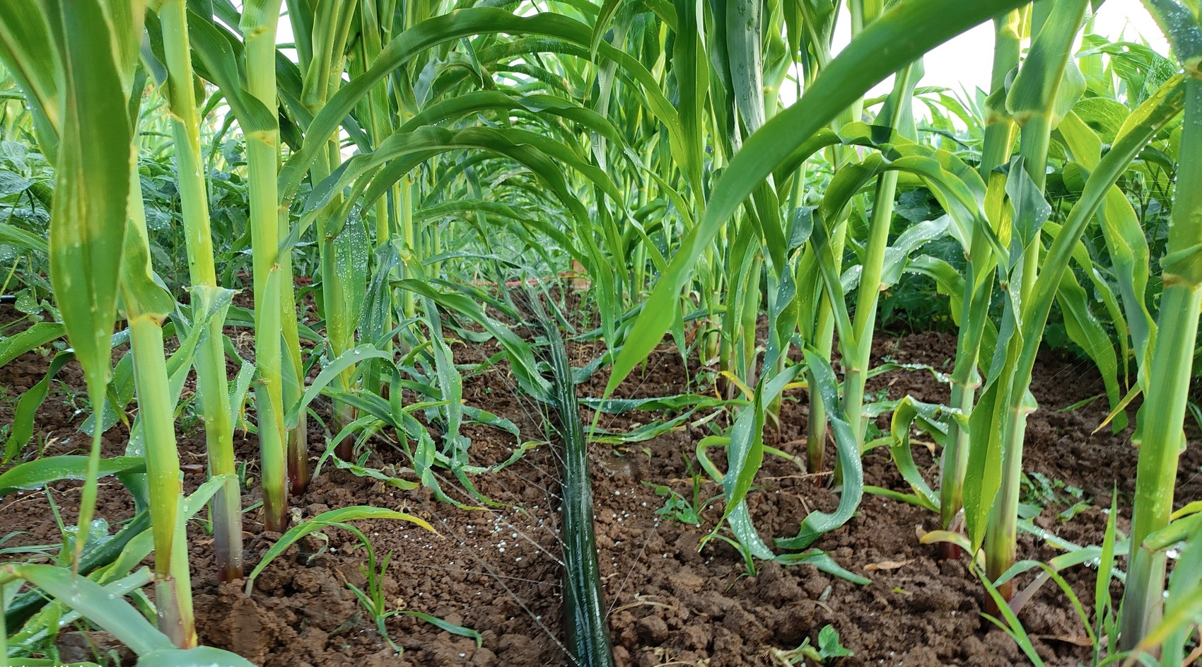 6月11日上午,遂宁市安居区奉光荣种植家庭农场中正在被浇灌的玉米。