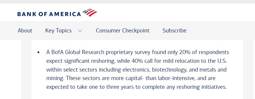 报告访问了56位证券业基本面分析师,仅有20%的分析师认为美国未来将有“显著”制造业回流,且仅限于资本密集型和涉及安全的特定产业。该报告调查范围覆盖全球九个市场、共1029家企业,总市值逾38万亿美元。