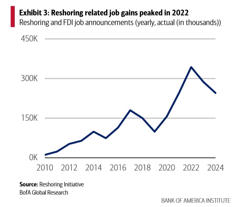报告显示,美国制造业回流创造的就业机会在2022年达到高峰后开始减少。