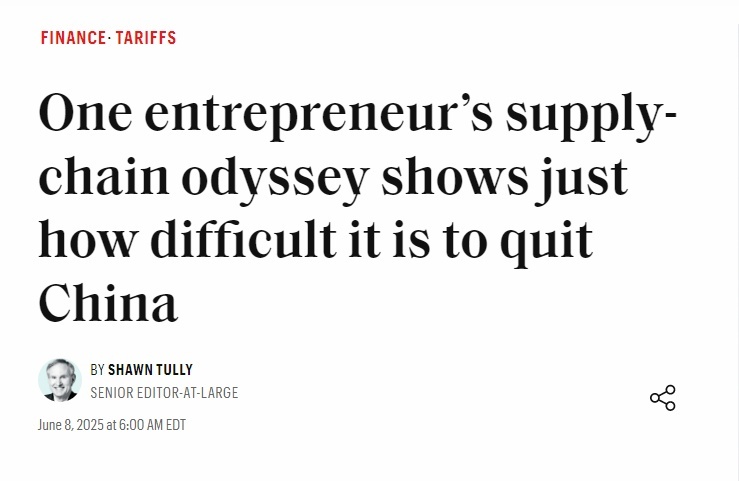 美国《财富》杂志网站6月8日刊发文章《一个企业家艰难“去中国化”的启示》,阐述了中国供应链与产业链的优势,也揭示了美国制造业回流面临的巨大挑战。