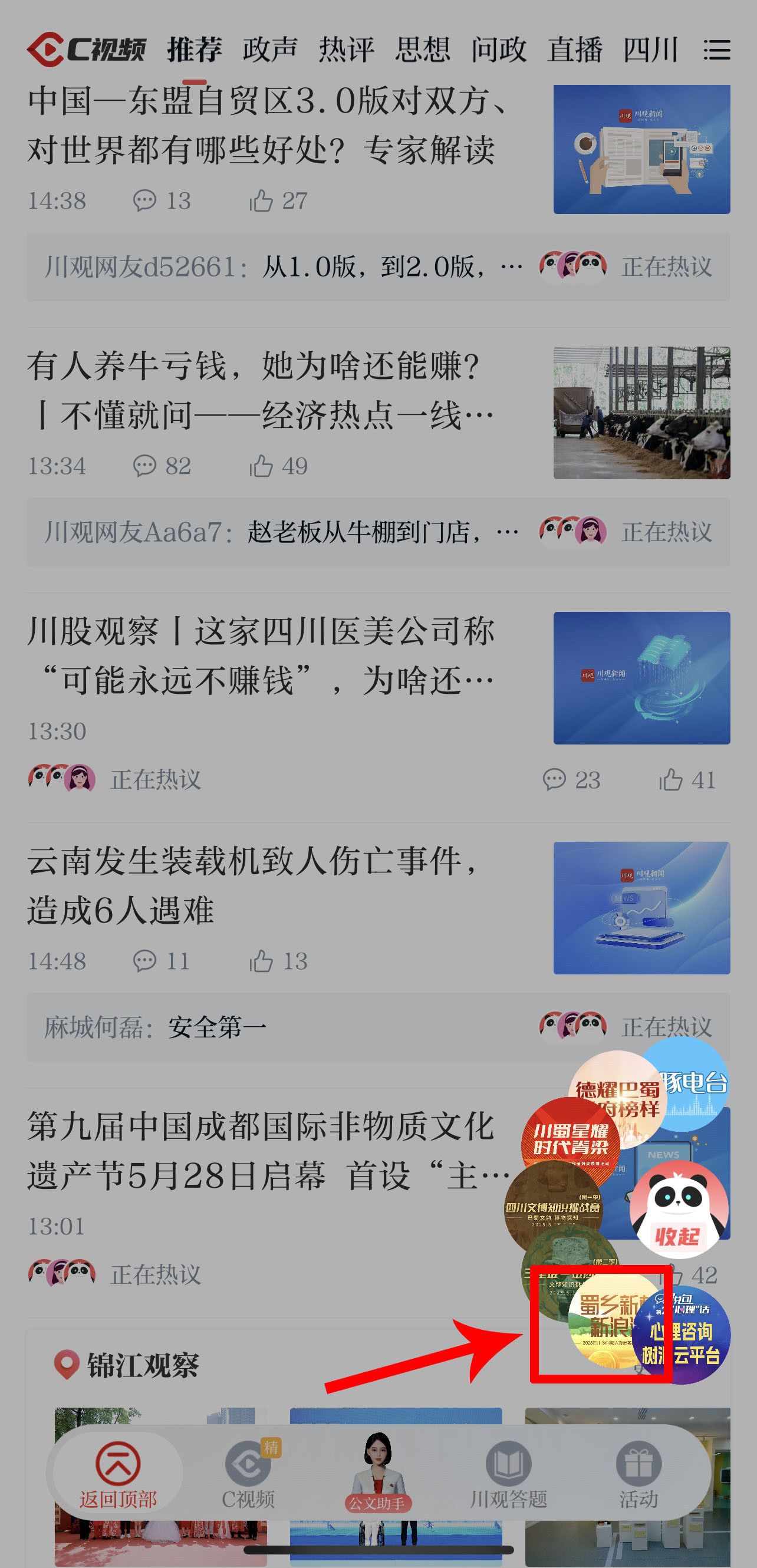 第二步,在川观新闻首页,点击右下方悬浮球,找到“蜀乡新村新浪潮”图片,点击即可参与。