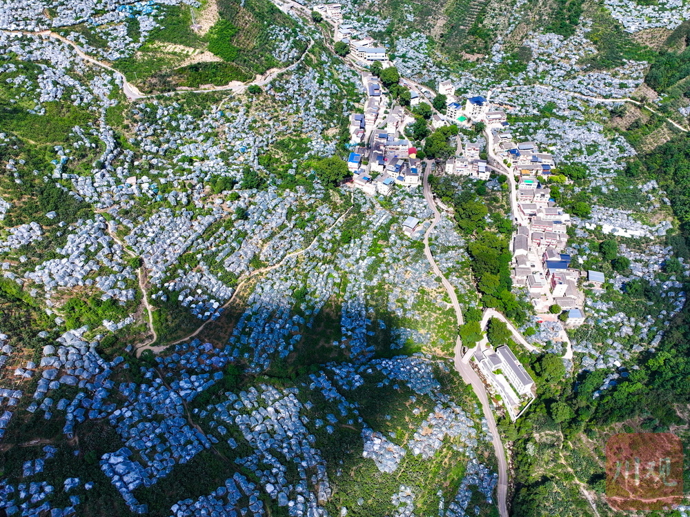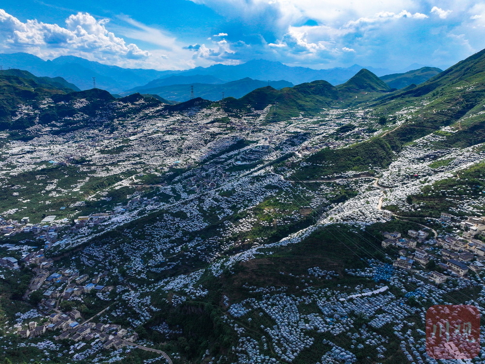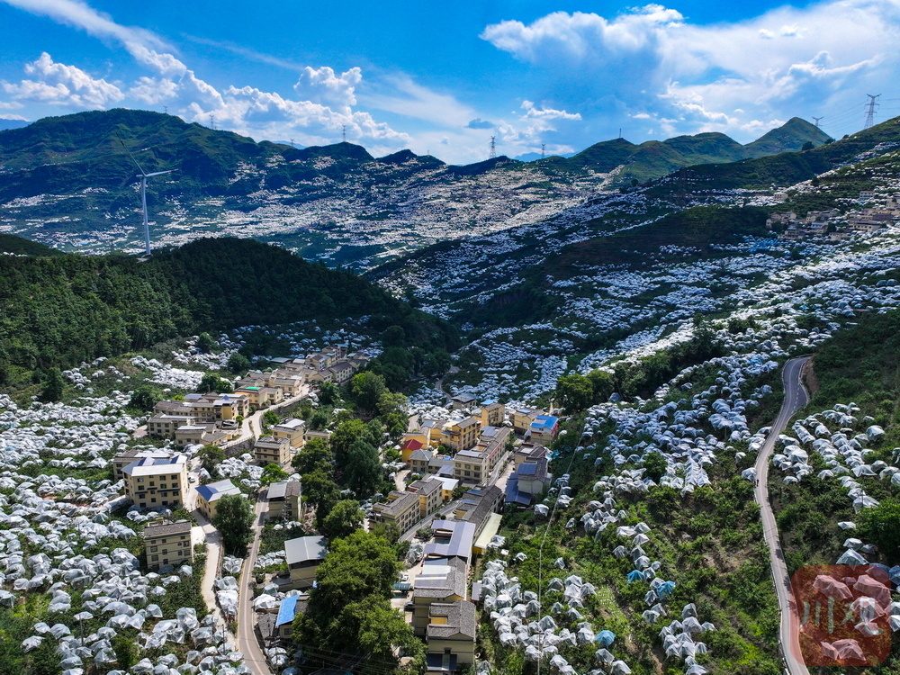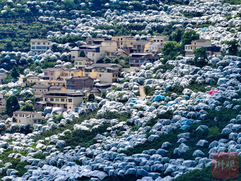 眼下正值雅安汉源甜樱桃上市时节。6月11日,走进汉源县清溪、富庄等地,漫山的甜樱桃园都穿上了“防晒装”,甜樱桃果实也套上了防雨防尘袋。远远望去,山头似覆盖夏日白雪,被“甜蜜”攻陷,白茫茫一片,蔚为壮观。