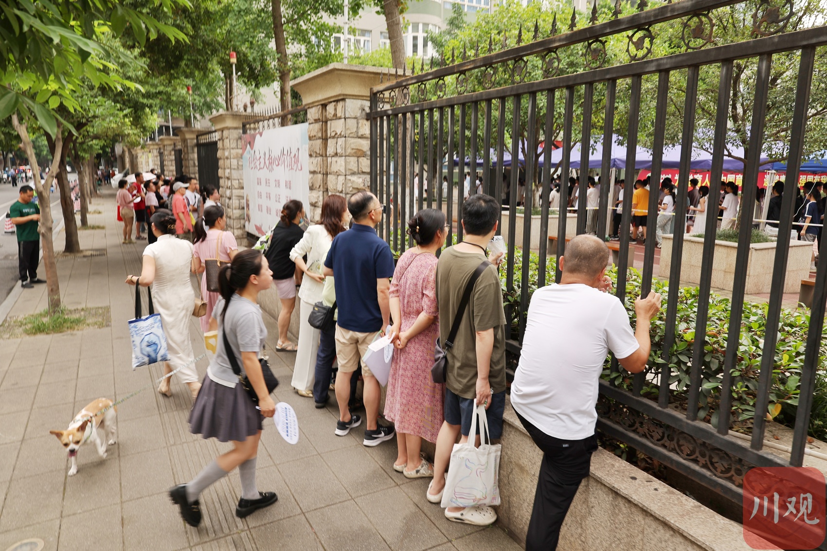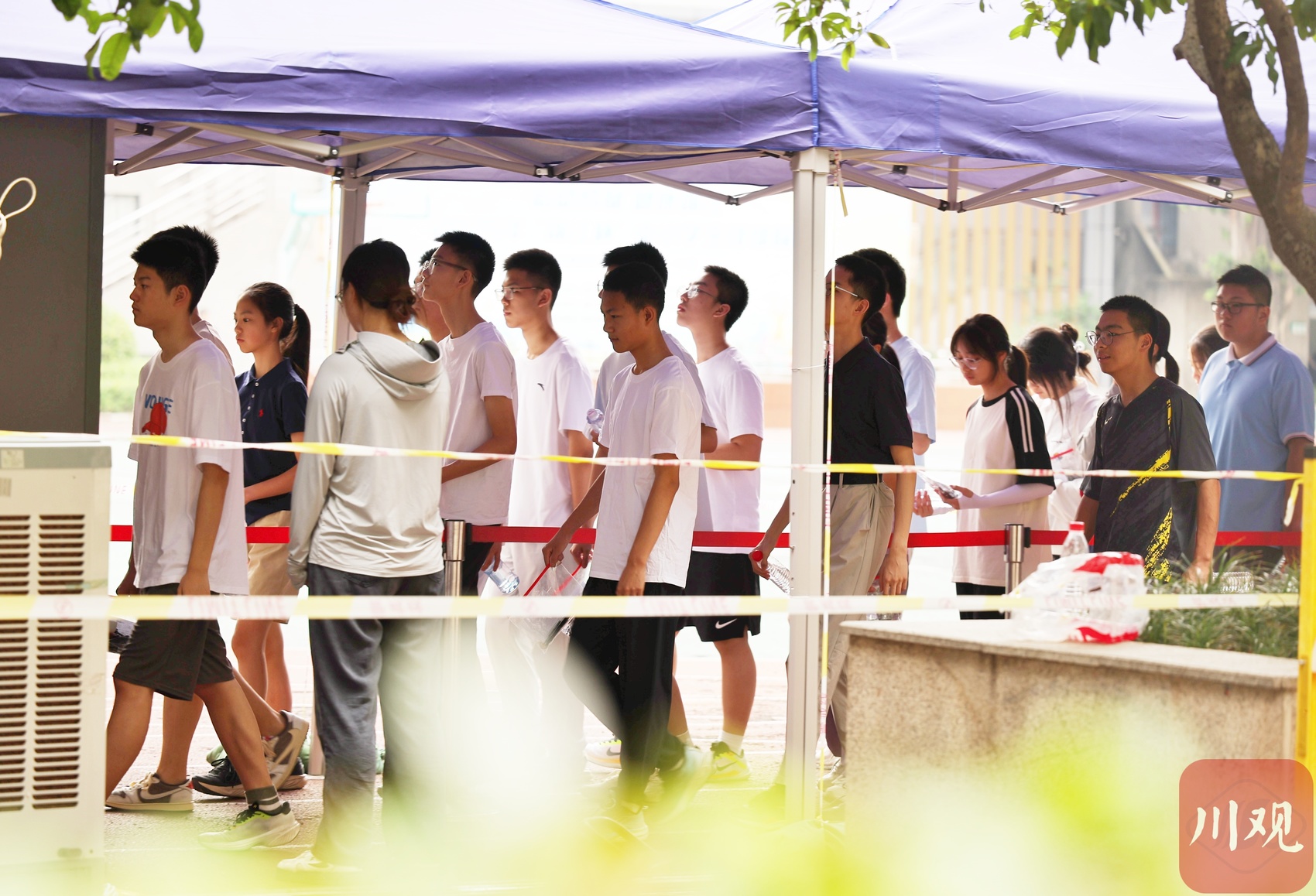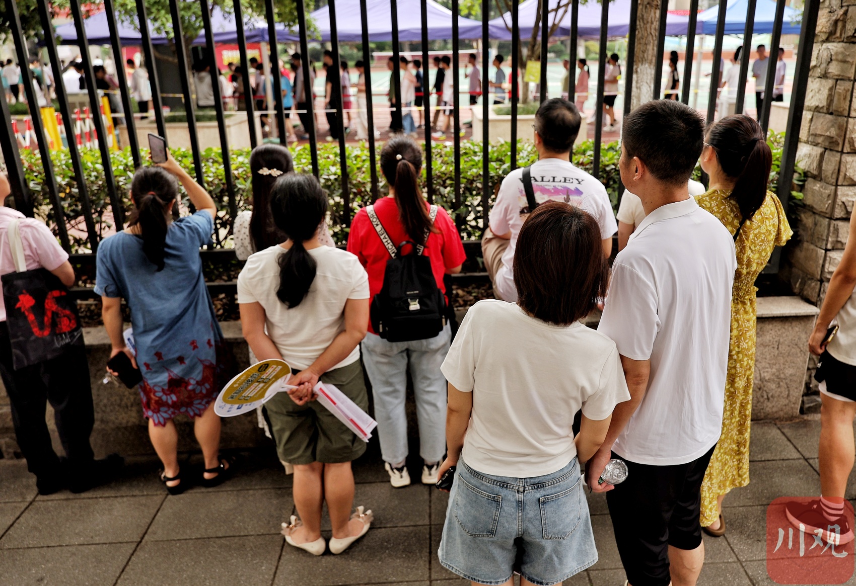 6月13日是2025年成都市中考首日。早上8时许,在四川师大附中书院分校高中部考点,考生们已经陆续进场,而翘首等候的家长们则聚集在街对面。