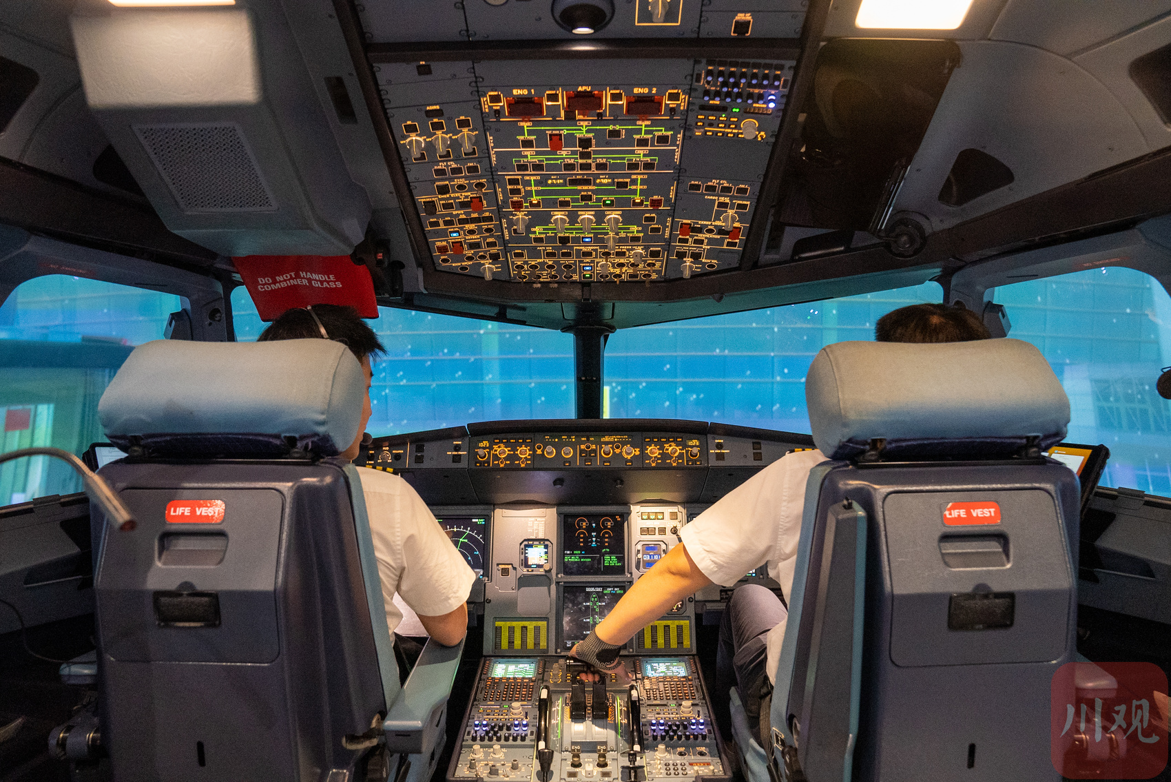 从理论到实践,熟练掌握飞行技能还需要一道重要环节,那便是模拟训练。模拟机训练中心就在广汉校区的对面,这里有波音、空客、赛斯纳等公司旗下各种机型的“模拟”机舱。走进空客A320的“模拟”机舱,这里的设备与真实的机舱完全一样。飞行教员邬雷正在指导3名学生,进行低温运行和防除冰练习。邬雷告诉记者,在这里,全动模拟机可以模拟出飞机遇上雨雪、昼夜、大雾等各类天气状况时的场景。“当冰雪、霜雾覆着在飞机表面,就会影响飞行气动性能。”邬雷介绍,同学们通常3人一组进入1个模拟机舱上课,“一堂课6小时,主驾、副驾、观察员,各位置学习2小时。”