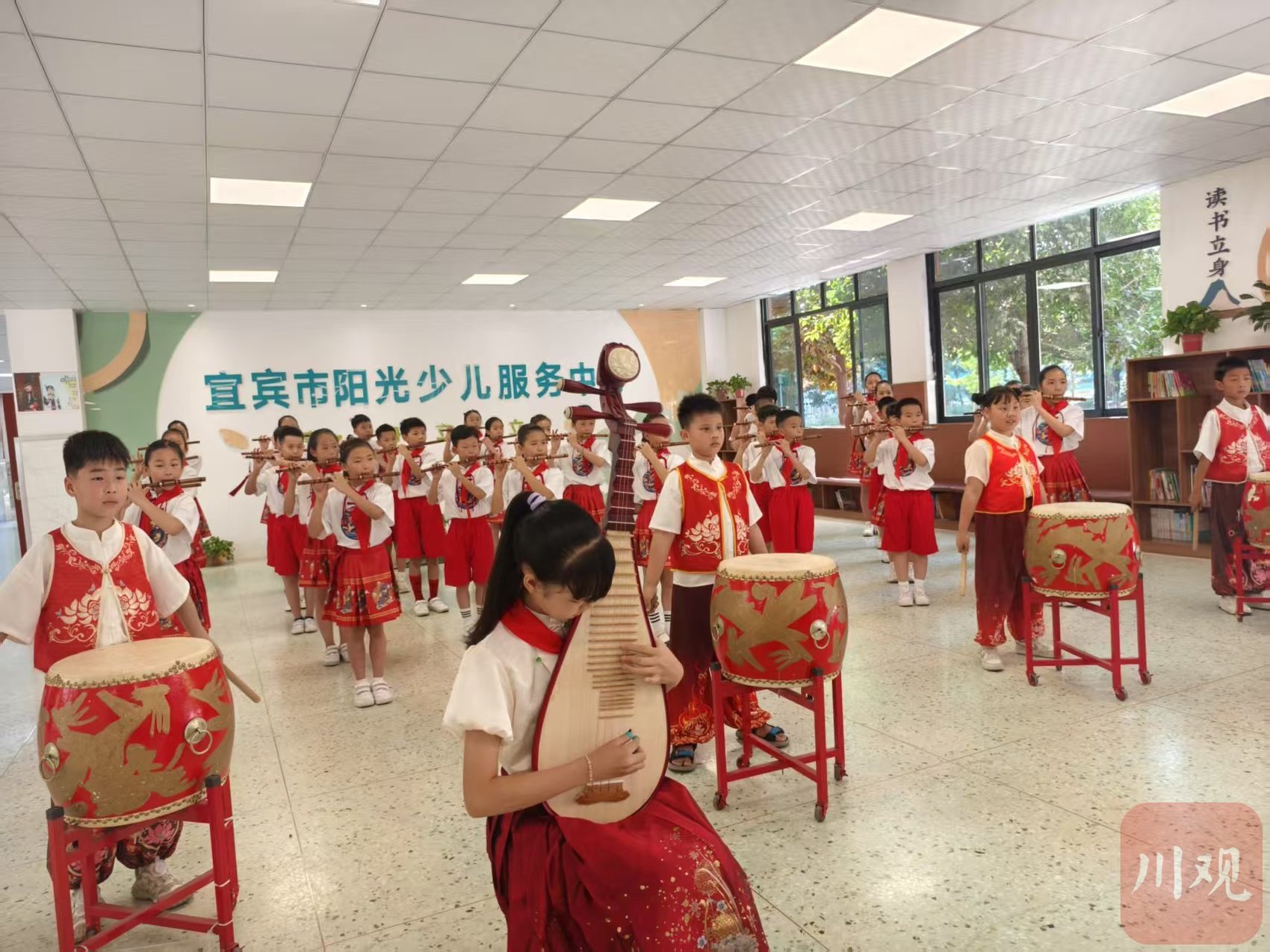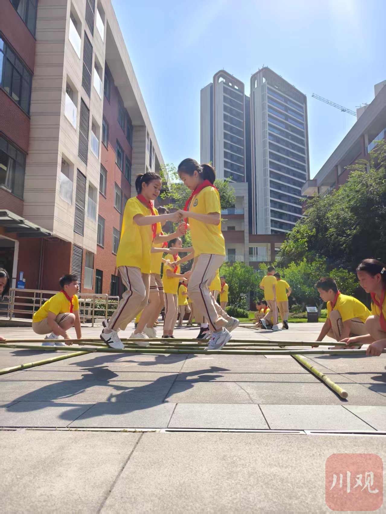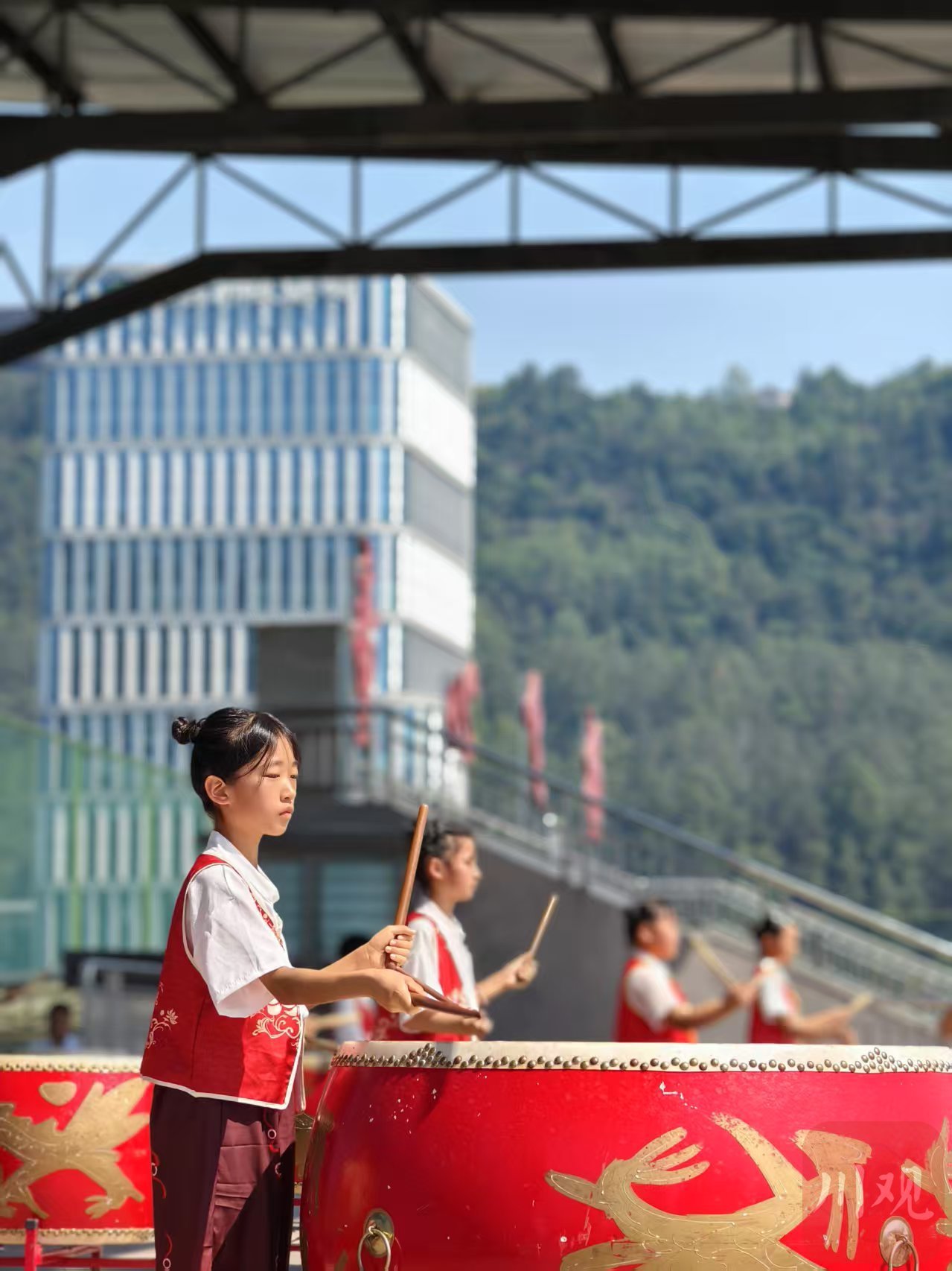 艳阳下的操场上传来激昂的鼓声,宜宾三江新区第一实验小学的一群小学生身着民族服饰,手持鼓槌,敲打出古老的旋律。