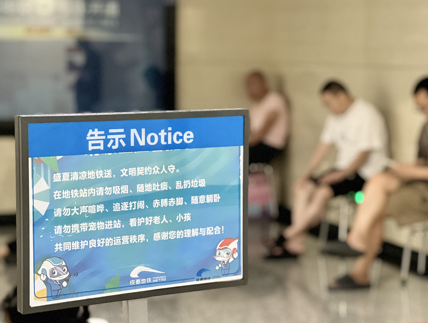 成都轨道集团温馨提醒,在地铁纳凉时,请不要在出入口通道、楼梯台阶等区域躺卧,也不要大声喧哗、吸烟、踩踏座椅、随意丢弃杂物或使用电子设备外放声音,不要在站内嬉戏打闹、奔跑等,文明纳凉,有序纳凉,安全纳凉,共同营造良好的乘车环境。