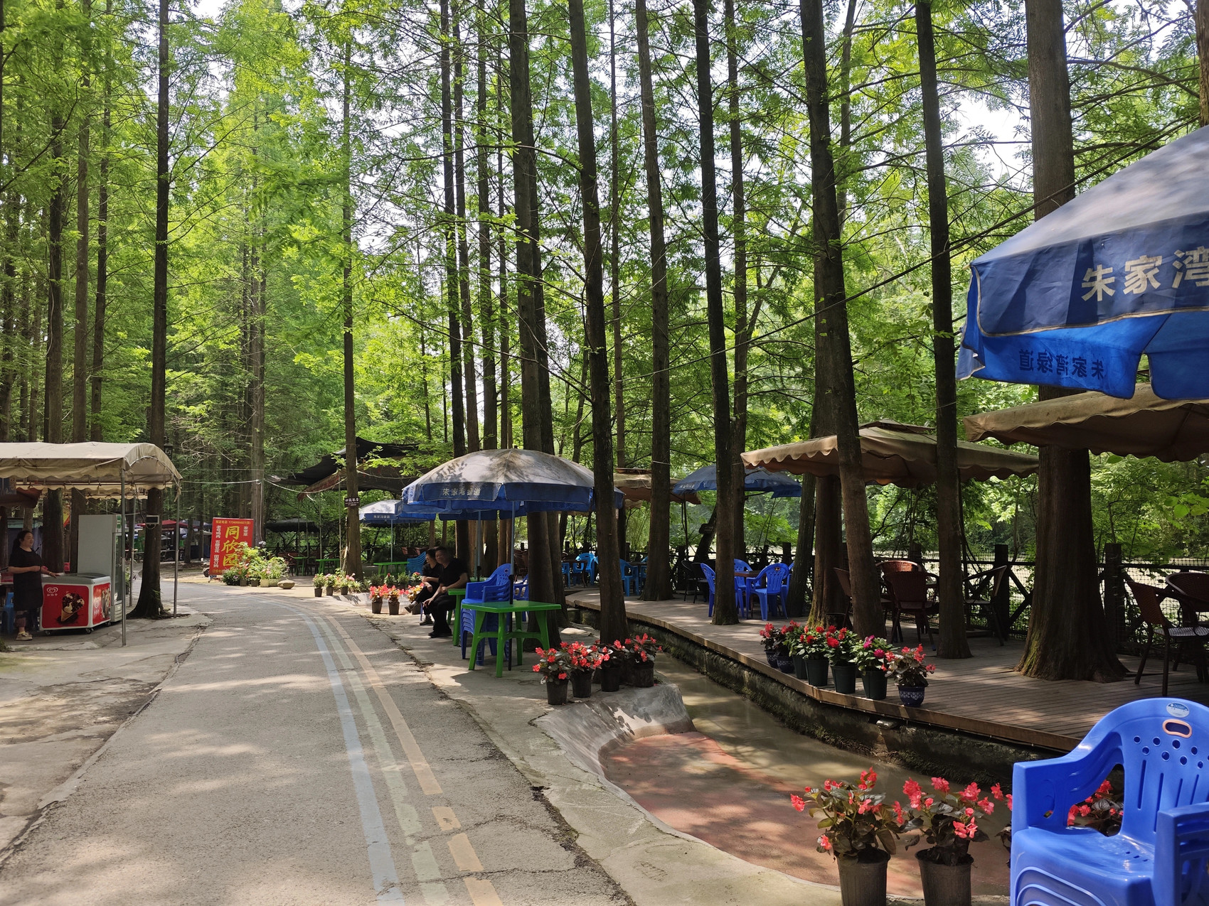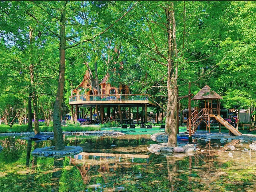 走进朱家湾林盘,扑面而来的是淙淙黑石河与高大水杉树交织的清凉。绿光森林营地入口处的“涌泉小景”正汩汩涌动,吸引几位游客拍照打卡。放眼望去,泉水顺溪流潺潺而过,架在小溪上的秋千,沿小径栽植的绣球花和绿植,倚靠着红墙的餐桌铺着白色的蕾丝,给人一种花园秘境的体验感。