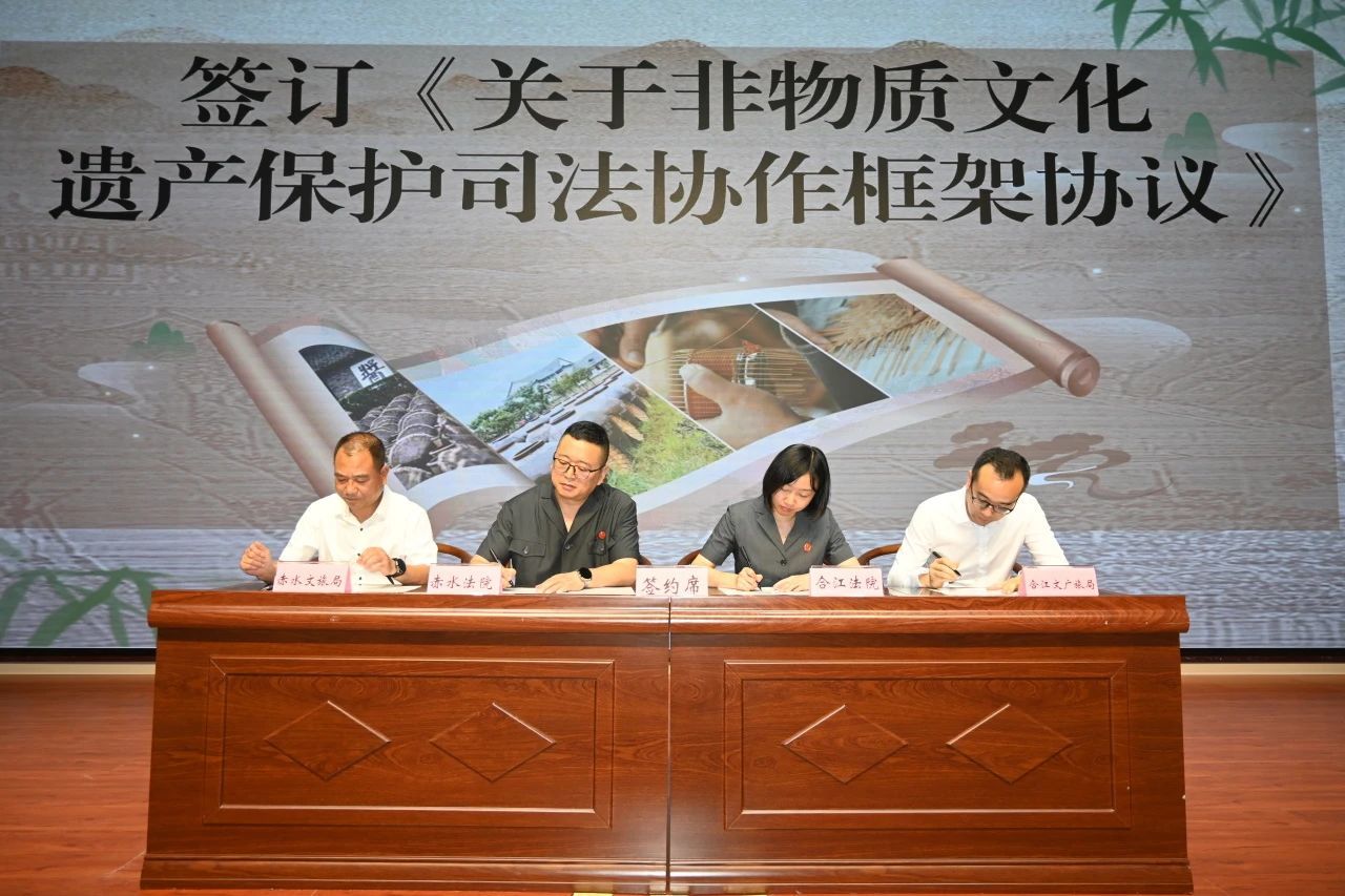 合江县人民法院、合江县文化广播电视和旅游局、贵州省赤水市人民法院、贵州省赤水市文化旅游局共签《关于非物质文化遗产保护司法协作框架协议》。合江县人民法院供图