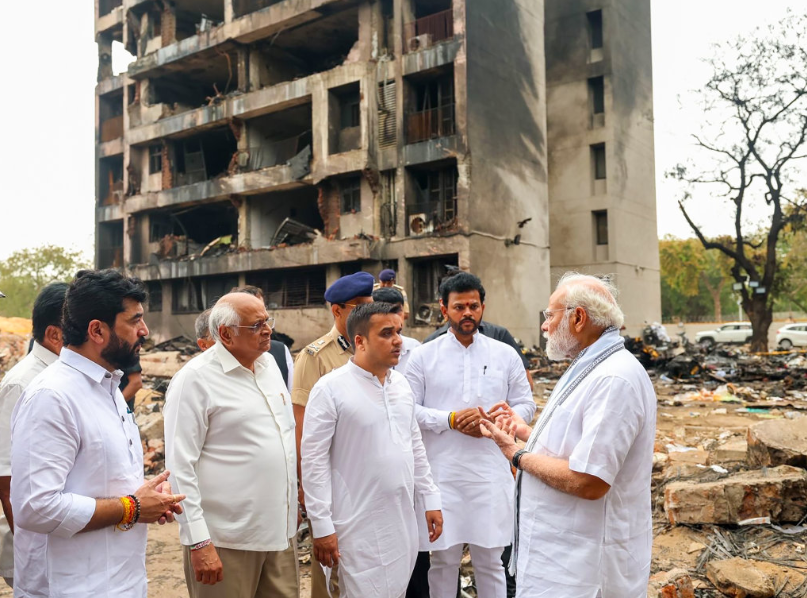 6月13日,印度总理莫迪(右一)视察古吉拉特邦艾哈迈达巴德机场附近的坠机现场。
