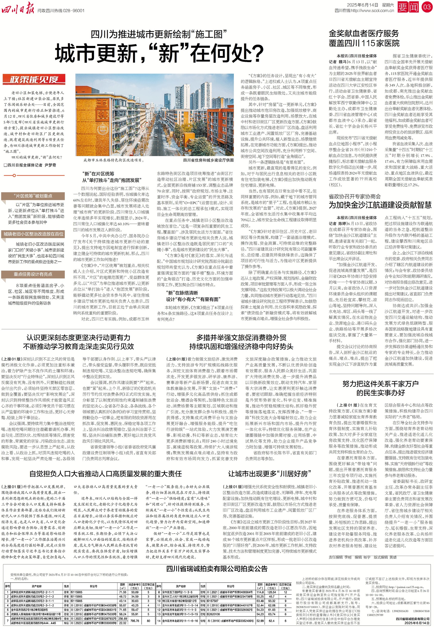 一部能坐上的电梯、一处有树有椅的口袋公园、一条通畅干净的下水道……城市更新,连接人们对美好生活的真实期待。6月12日,《四川省实施城市更新行动方案》发布,提出城镇老旧小区整治改造、城中村和老旧街区厂区更新改造、既有建筑改造利用等8项重点任务,为四川推进城市更新工作绘制“施工图”。今日三版,看四川城市更新“新”在何处?