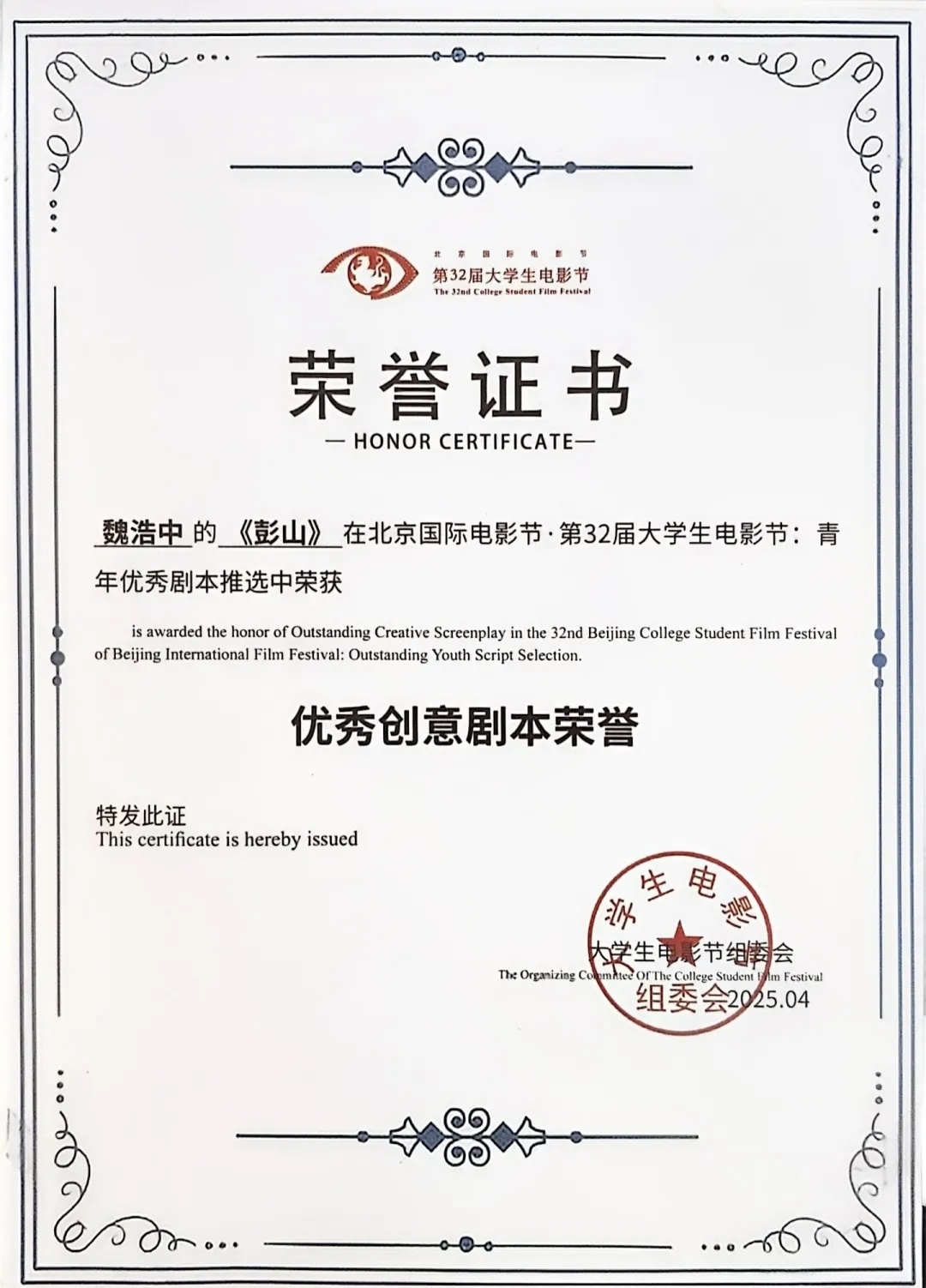 一场融合杀戮与历史的古法迷局,一段充满追捕与逃亡的悬疑大案,一次围绕文物与复仇的终极对决,最终在奔腾的岷江畔落下帷幕……近日,在北京国际电影节・第32届大学生电影节——青年优秀剧本推选活动中,彭山学子魏浩中创作的原创剧本《彭山》,从近600部参赛剧本里脱颖而出,荣获“优秀创意剧本”荣誉。