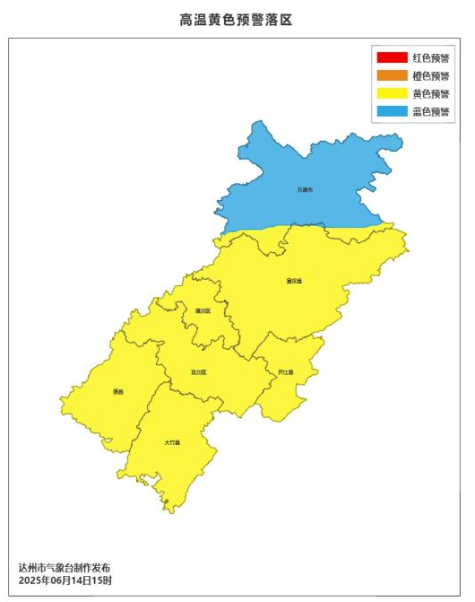 达州市气象台6月14日下午发布高温黄色预警,预计6月15至17日,渠县、达川区、宣汉县、通川区、达州高新区、达州东部经开区、大竹县及开江县日最高气温可达36~39℃,局地40℃以上,万源35~37℃。