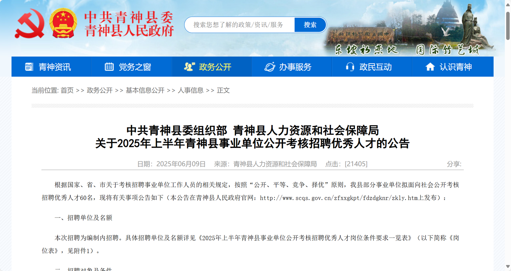 6月15日,川观新闻从青神县人民政府网获悉,该县将按照“公开、平等、竞争、择优”原则,面向社会公开考核招聘优秀人才60名。
