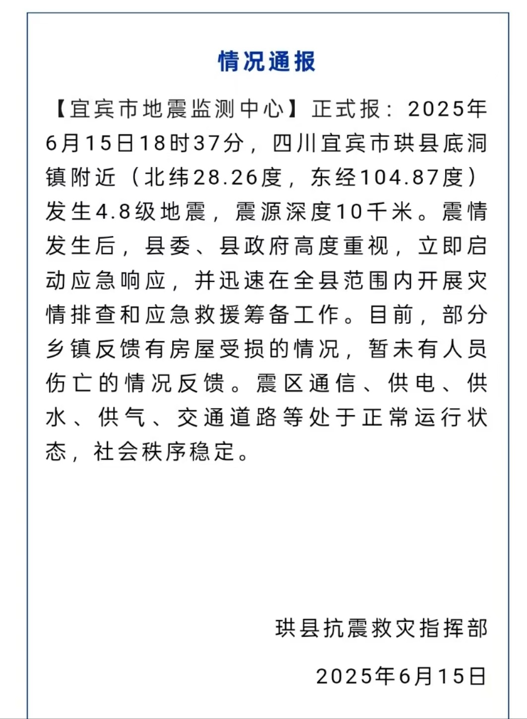 2025年6月15日18时37分,四川宜宾市珙县底洞镇附近(北纬28.26度,东经104.87度)发生4.8级地震,震源深度10千米。震情发生后,珙县立即启动应急响应,并迅速在全县范围内开展灾情排查和应急救援筹备工作。