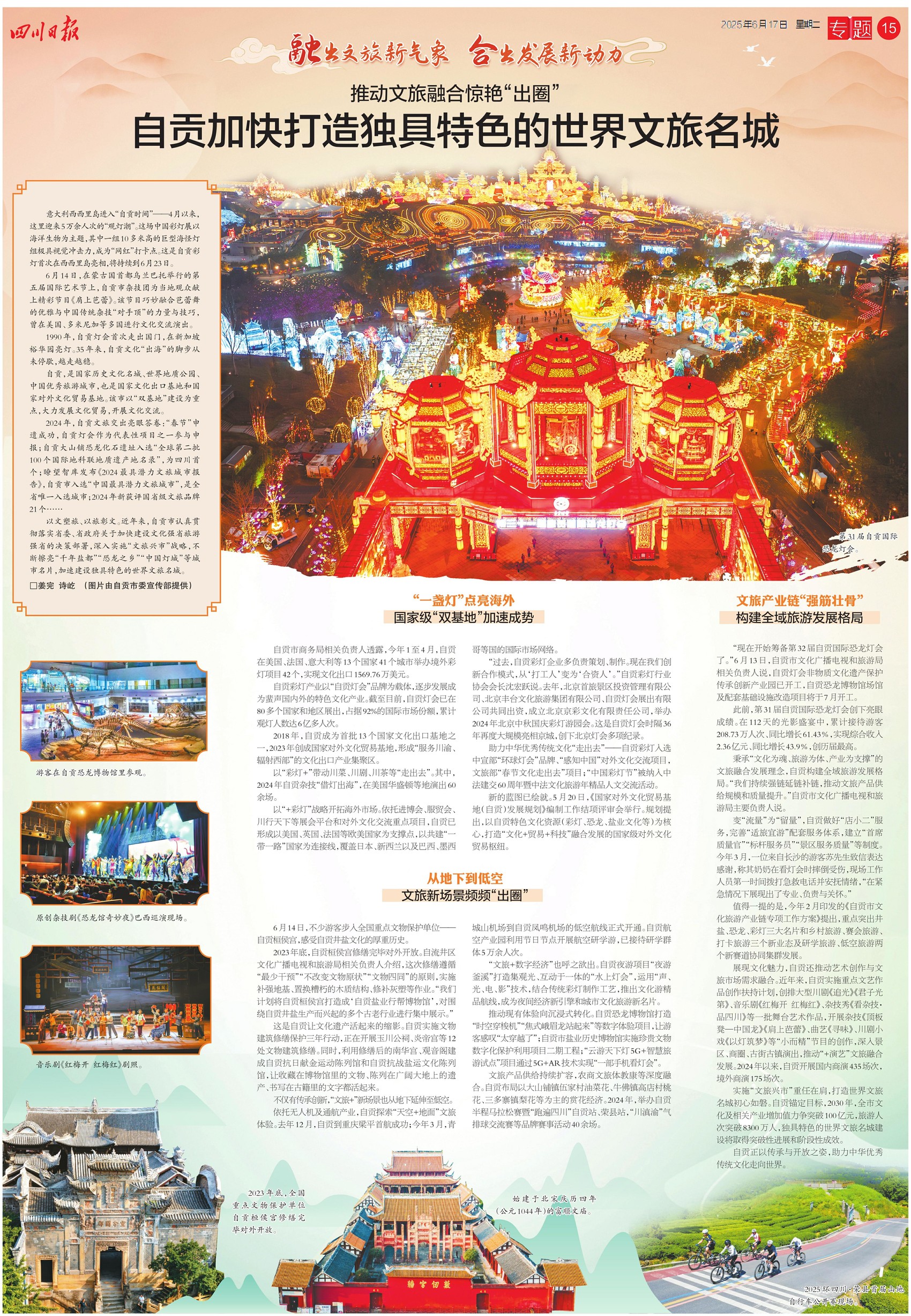 值此节点,《四川日报》整版关注自贡市如何加速建设独具特色的世界文旅名城,以下是原文报道,一起来看——
