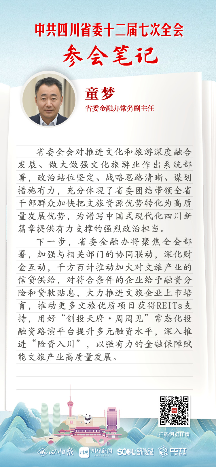 下一步,省委金融办将聚焦全会部署,加强与相关部门的协同联动,深化财金互动,千方百计推动加大对文旅产业的信贷供给,对符合条件的企业给予融资分险和贷款贴息,大力推进文旅企业上市培育,推动更多文旅优质项目获得REITs支持,用好“创投天府·周周见”常态化投融资路演平台提升多元融资水平,深入推进“险资入川”,以强有力的金融保障赋能文旅产业高质量发展。