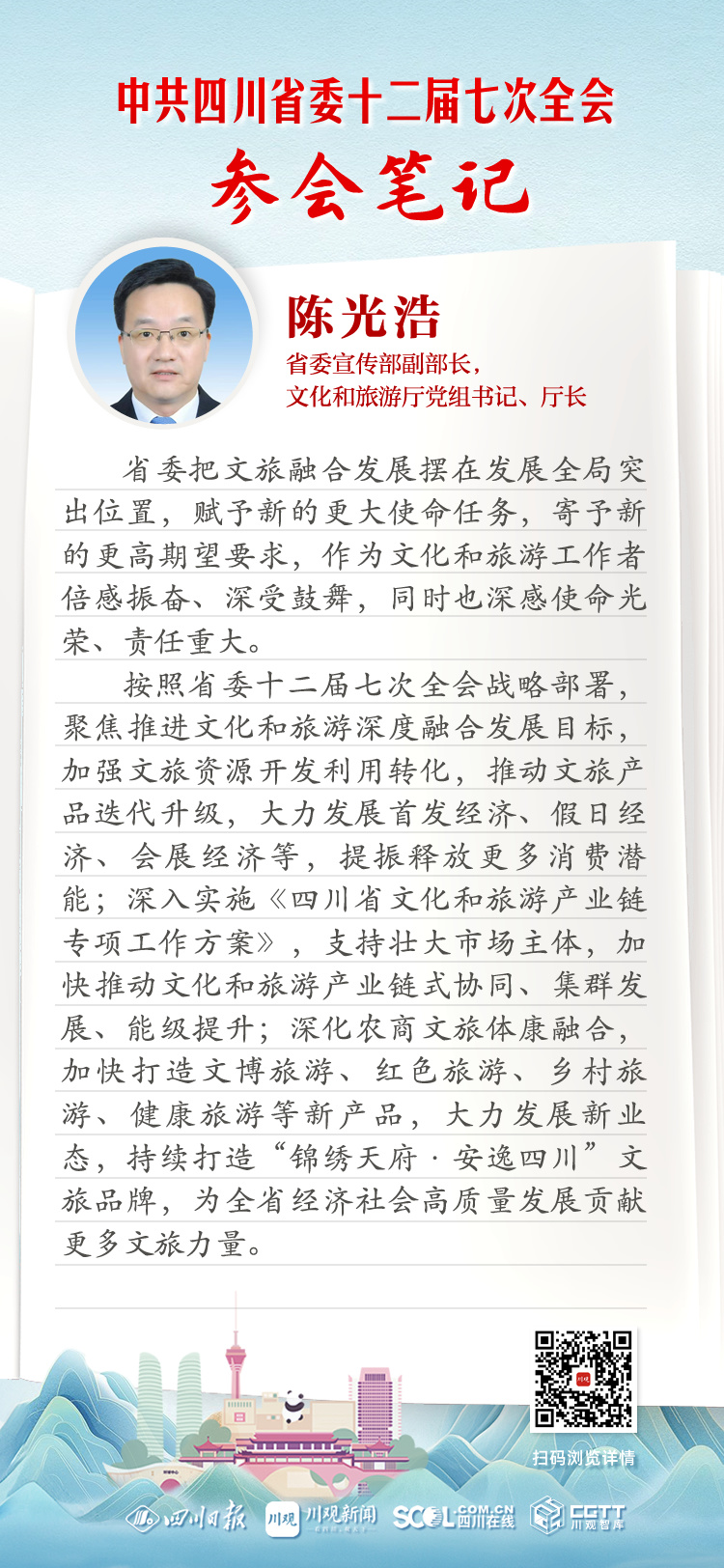 这次省委全会,是在全省上下深入学习贯彻党的二十大和二十届三中全会精神、奋力谱写中国式现代化四川新篇章的关键时期,召开的一次十分重要的会议。省委把文旅融合发展摆在发展全局突出位置,赋予新的更大使命任务,寄予新的更高期望要求,作为文化和旅游工作者倍感振奋、深受鼓舞,同时也深感使命光荣、责任重大。