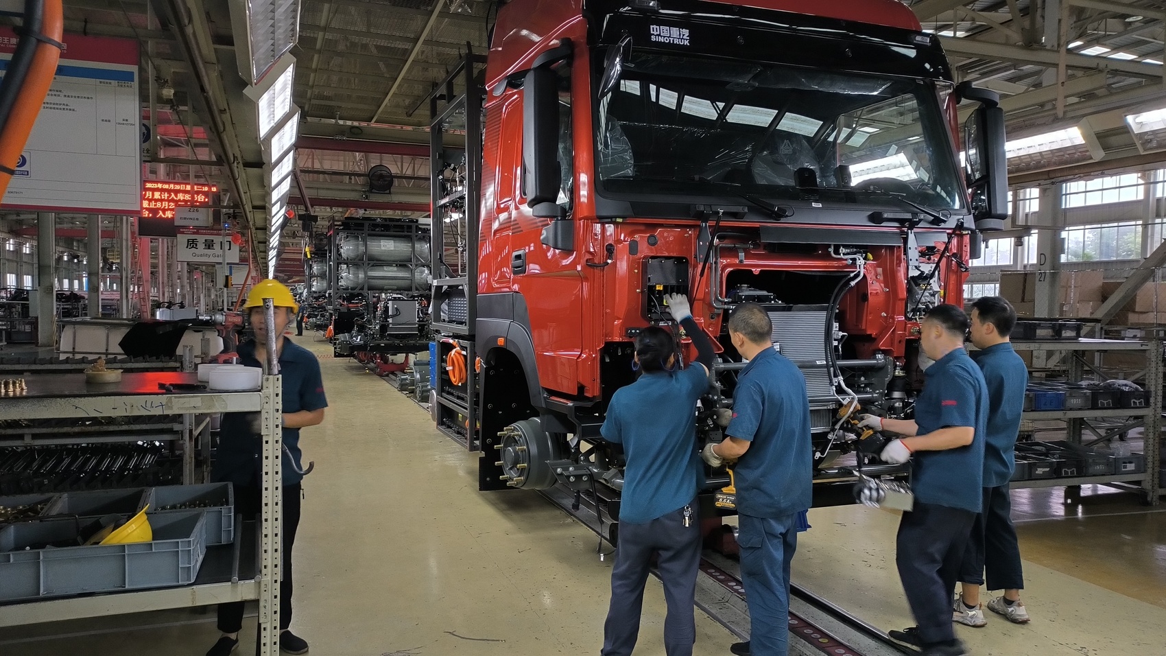 走进重汽成商的总装车间,大约每三辆下线重卡中,就有一辆是新能源。“就在两年前,我们的新能源车型占比还不到一成。”重汽成商相关负责人告诉记者。