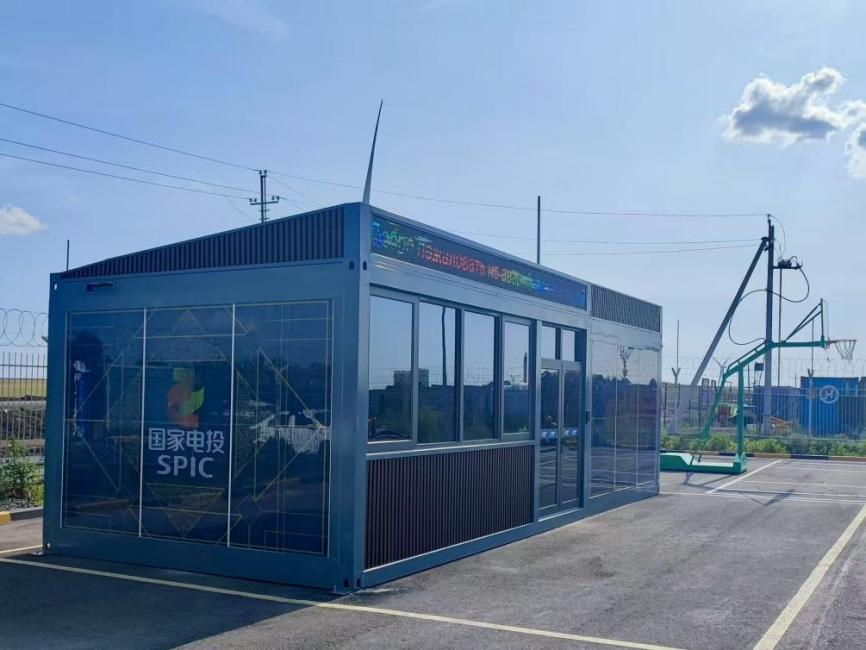 国家电投哈萨克斯坦能源投资公司阿克莫拉项目部负责人蔡慧勇介绍安全小屋和项目整体情况。本报记者 李洋 摄