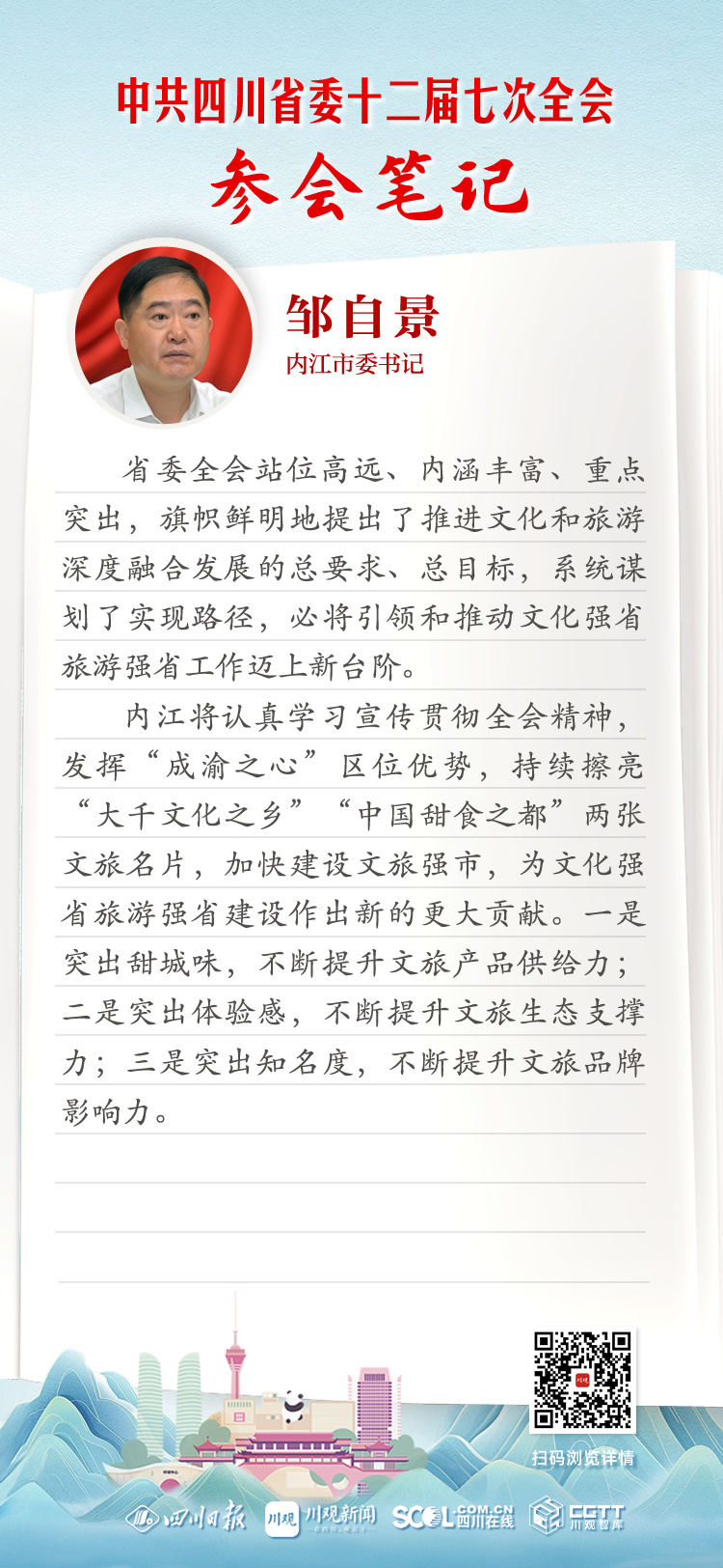 内江将认真学习宣传贯彻全会精神,发挥“成渝之心”区位优势,持续擦亮“大千文化之乡”“中国甜食之都”两张文旅名片,加快建设文旅强市,为文化强省旅游强省建设作出新的更大贡献。一是突出甜城味,不断提升文旅产品供给力;二是突出体验感,不断提升文旅生态支撑力;三是突出知名度,不断提升文旅品牌影响力。