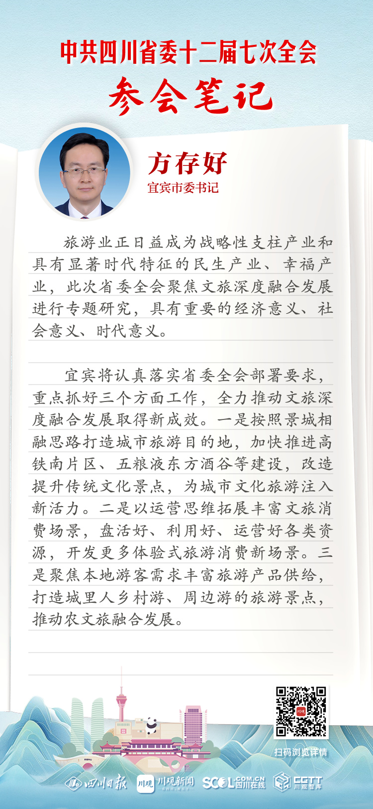 宜宾将认真落实省委全会部署要求,重点抓好三个方面工作,全力推动文旅深度融合发展取得新成效。一是按照景城相融思路打造城市旅游目的地,加快推进高铁南片区、五粮液东方酒谷等建设,改造提升传统文化景点,为城市文化旅游注入新活力。二是以运营思维拓展丰富文旅消费场景,盘活好、利用好、运营好各类资源,开发更多体验式旅游消费新场景。三是聚焦本地游客需求丰富旅游产品供给,打造城里人乡村游、周边游的旅游景点,推动农文旅融合发展。