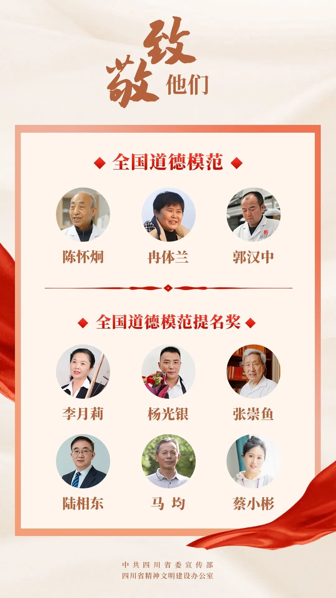 值得关注的是,在此前举行的全国精神文明建设表彰大会上,来自四川的陈怀炯、冉体兰、郭汉中等3人被授予全国道德模范荣誉称号,李月莉、杨光银、张崇鱼、陆相东、马均、蔡小彬等6人被授予全国道德模范提名奖。
