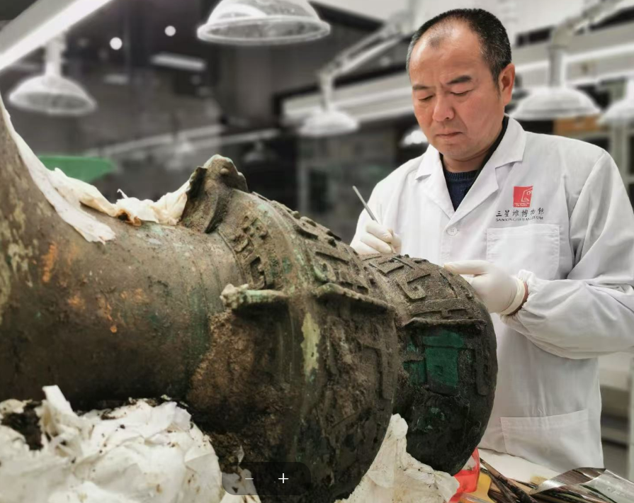 2019年末,三星堆启动新一轮发掘,祭祀坑的象牙提取成为难点。为避免糟朽的象牙断裂损坏,郭汉中创造性地采用给象牙打高分子“绷带”的蜡模固型加固方式,让上百根珍贵的象牙全部安全出坑。2020年3月,三星堆遗址祭祀区新一轮考古新发现进行现场直播。在全国观众注视下,郭汉中将3号祭祀坑内的青铜大口尊提取出坑,整个过程一气呵成,文物安全无损。