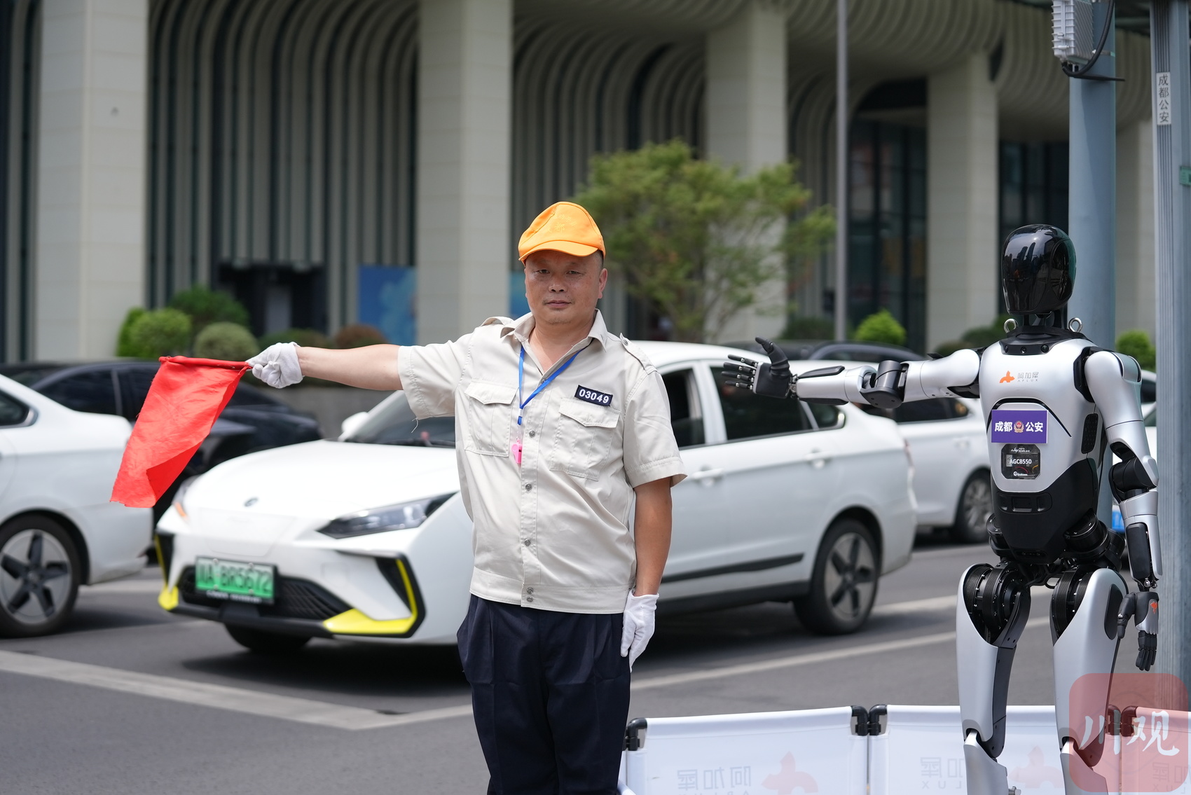 在东御街与顺城大街路口,具身智能人形机器人“通天晓”化身文明交通劝导员,能够根据交通信号灯变化挥动双臂指挥交通,提示行人“注意来往车辆”。