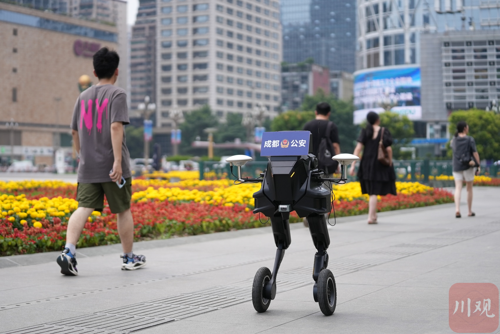在天府广场,轮式机器人可实现自主导航、轻松避障、远程监控等功能,能适应多种地形条件。