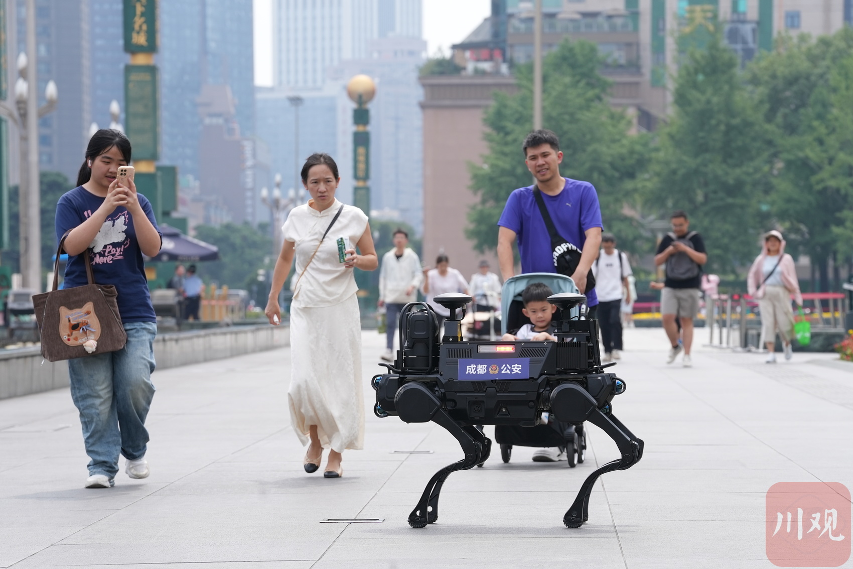 在天府广场,四足机器狗正协助民警开展治安巡逻任务。