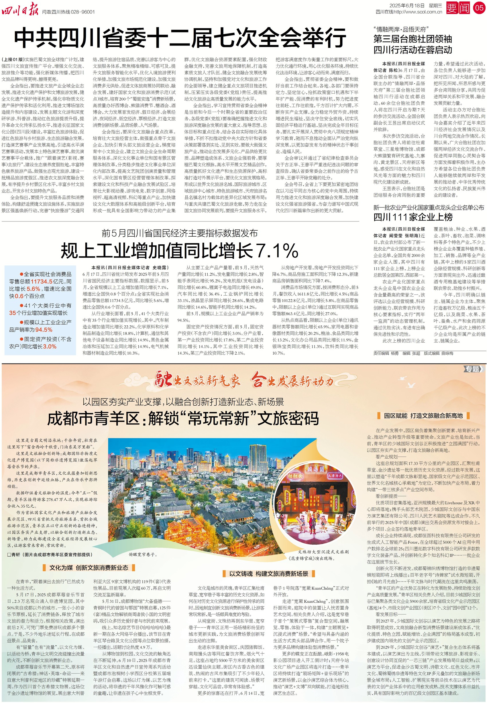 6月17日,四川省统计局发布2025年前5月四川经济“成绩单”。数据显示,前5月,全省规模以上工业增加值同比增长7.1%,增速比全国快0.8个百分点,工业稳中向好;全省实现社会消费品零售总额11734.5亿元,同比增长5.6%,增速比全国快0.6个百分点,消费强势增长。关注今日五版,看四川前5月经济平稳增长背后有哪些动能和支撑?