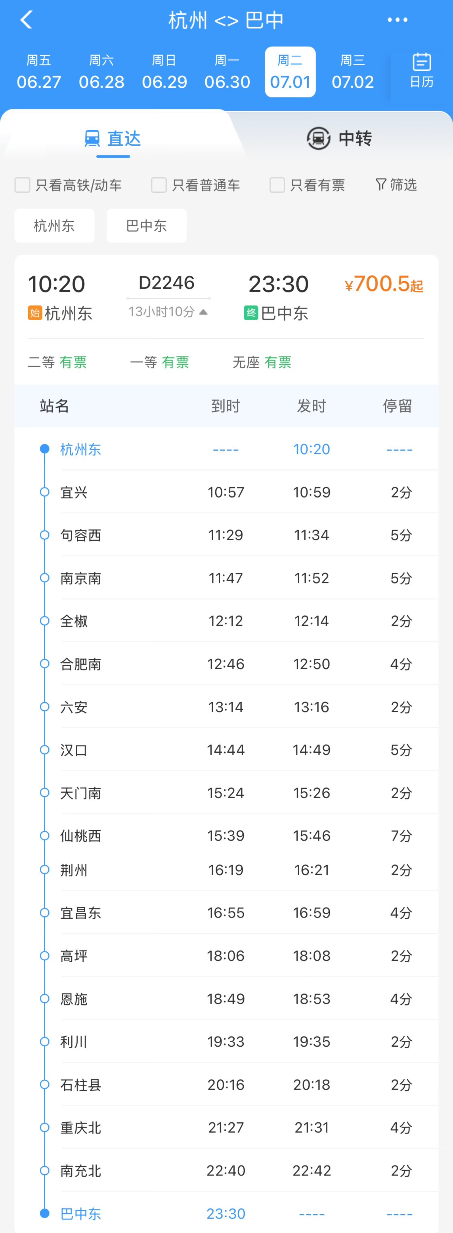 杭州东至巴中东D2246次列车,杭州东10:20开,沿途停靠宜兴、句容西、南京南、全椒、合肥南、六安、汉口、天门南、仙桃西、荆州、宜昌东、高坪、恩施、利川、石柱县、重庆北、南充北,23:30抵达巴中东,全程运行13小时10分。全程票价为一等座1119.5元,二等座700.5元。