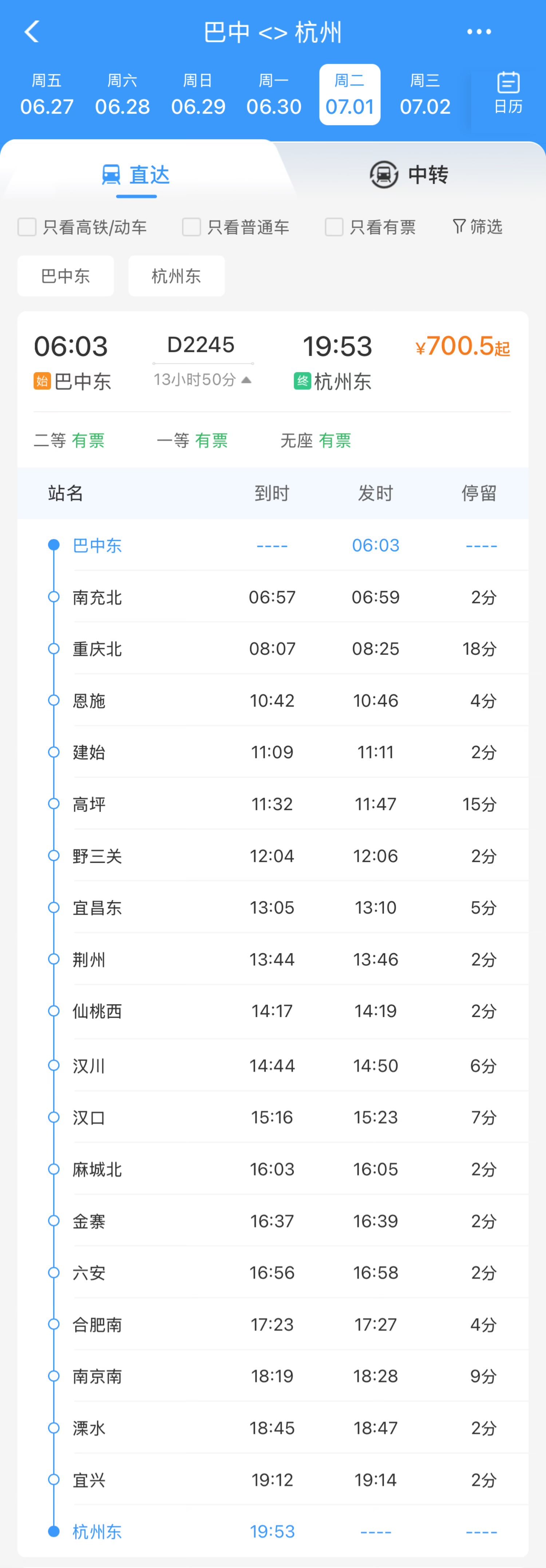 从7月1日起,巴中东至杭州东开行D2245次列车,巴中东06:03开,沿途停靠南充北、重庆北、恩施、建始、高坪、野三关、宜昌东、荆州、仙桃西、汉川、汉口、麻城北、金寨、六安、合肥南、南京南、溧水、宜兴,19:53抵达杭州东,全程运行13小时50分。全程票价为一等座1119.5元,二等座700.5元。据了解,这也是巴中市首次开往长三角方向的动车。