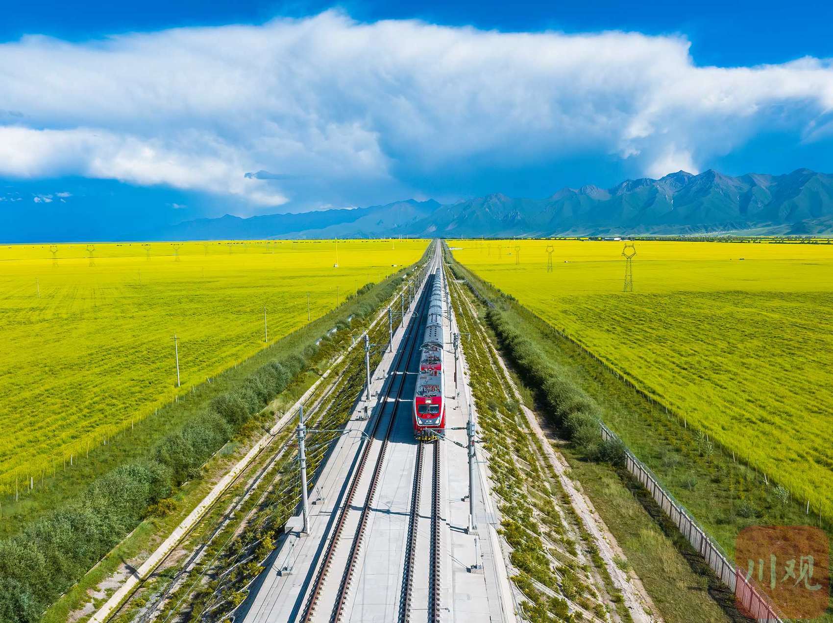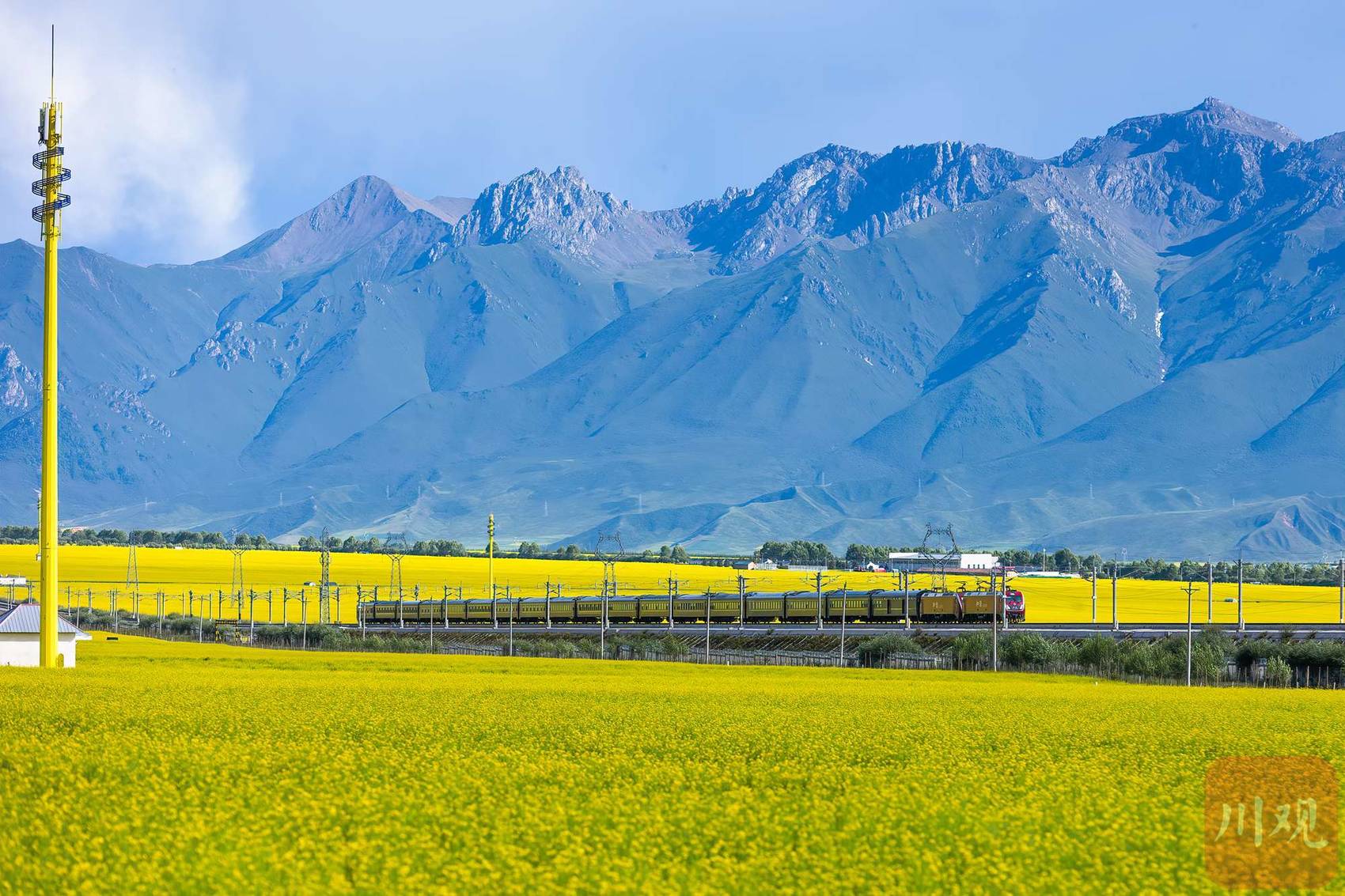 青海门源县青石咀镇,列车穿行在油菜花海。