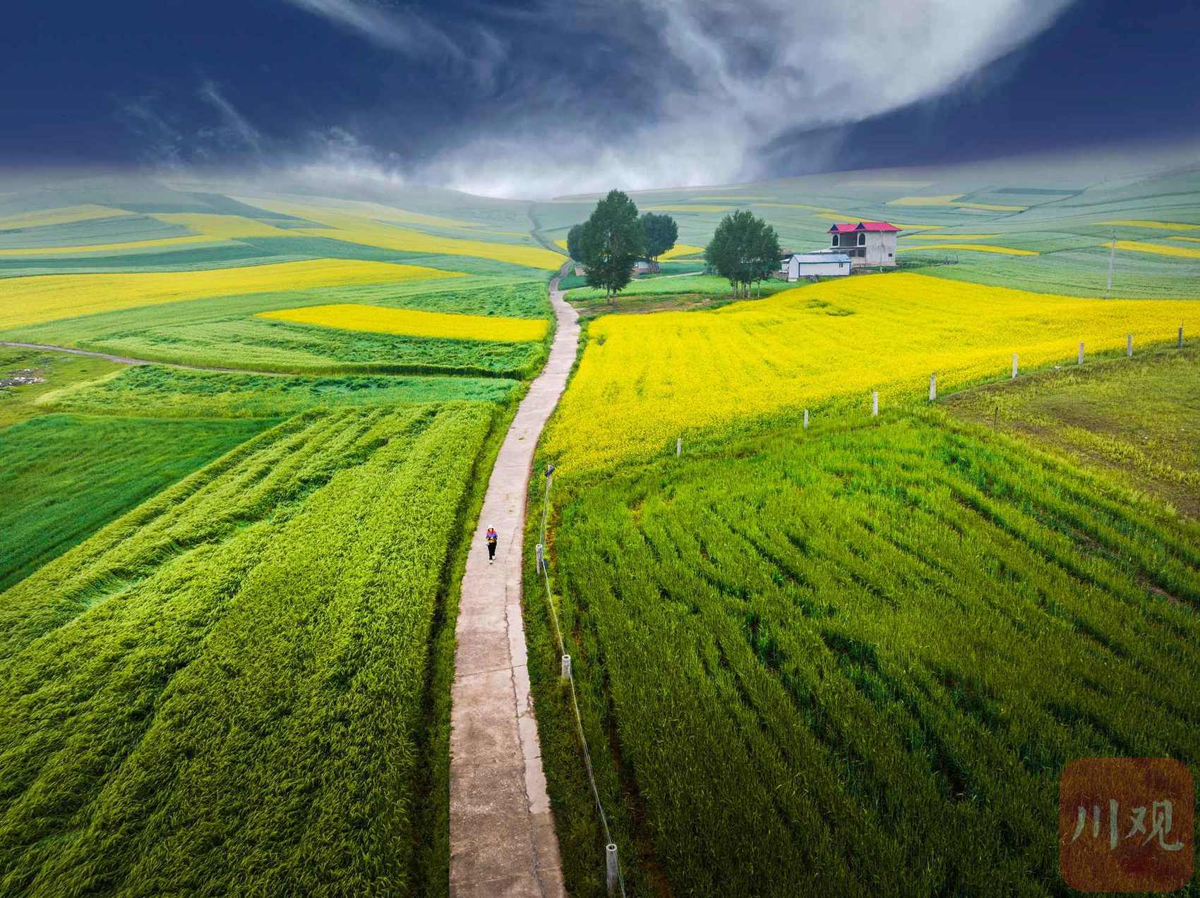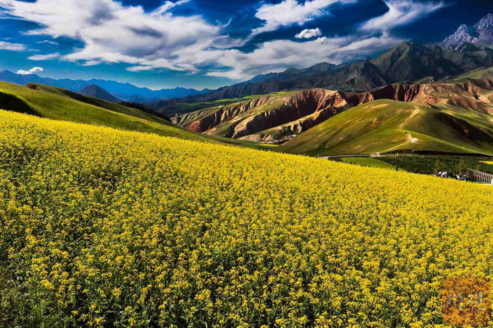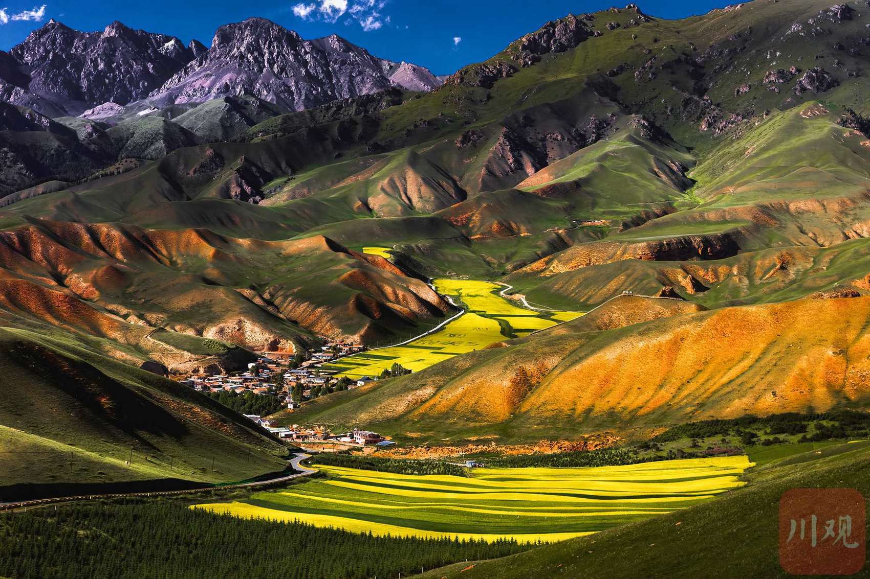 青海祁连县八宝镇卓尔山下,油菜花海与村落相依成画。