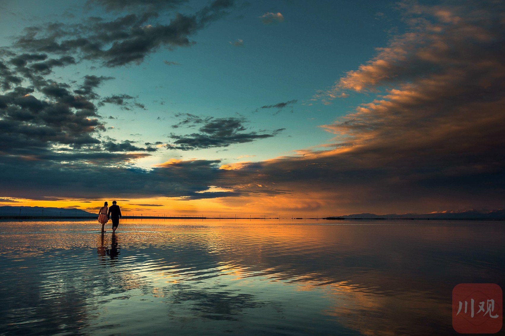 青海海西州茶卡盐湖被万丈霞光笼罩。