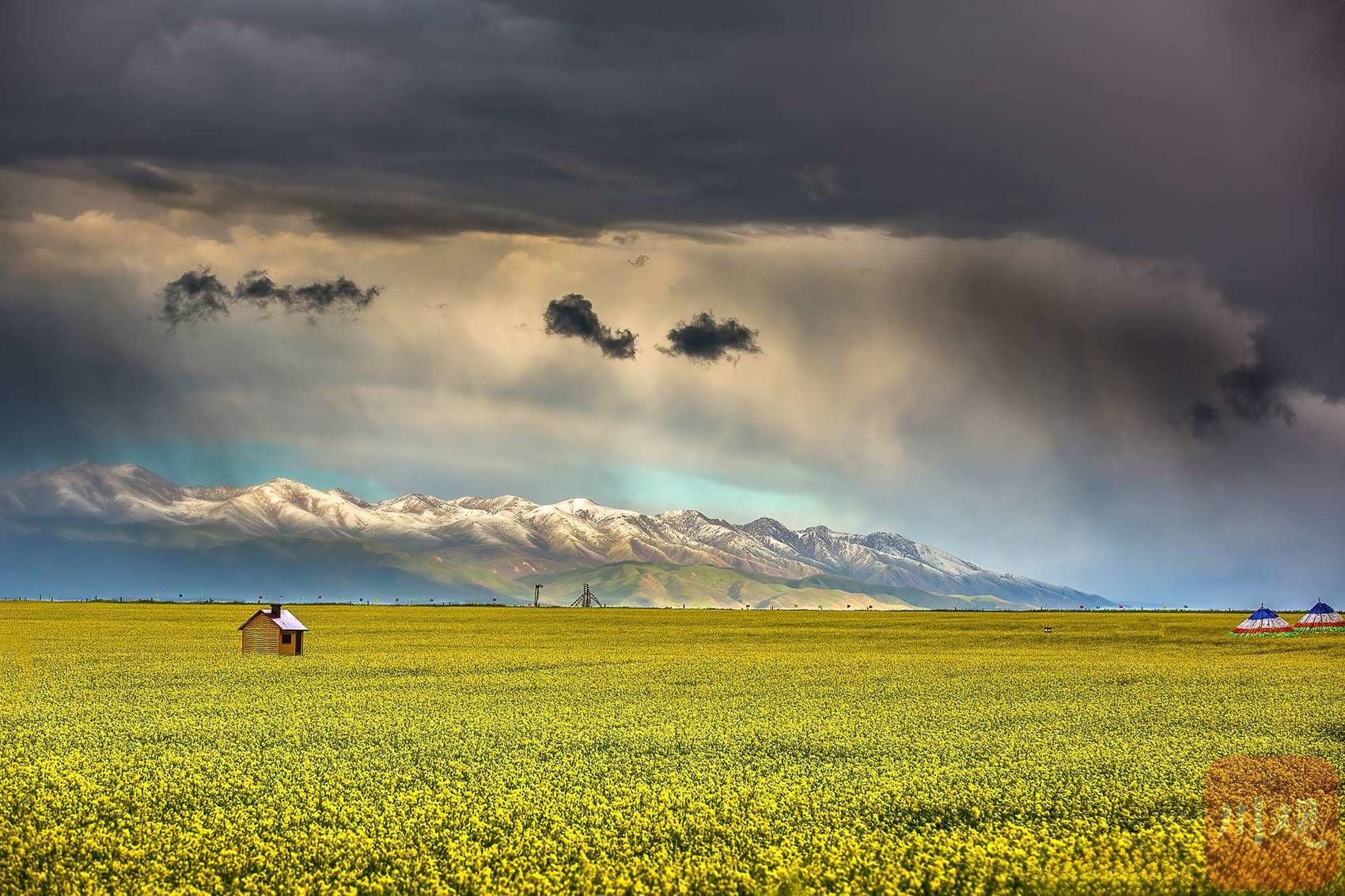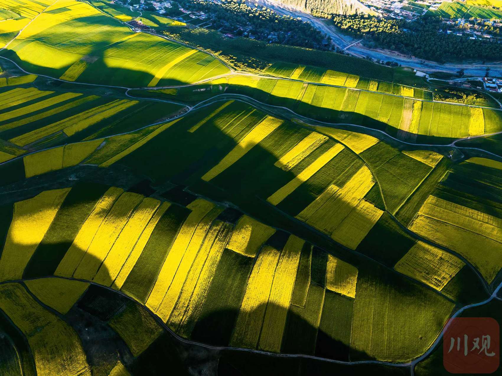 青海祁连县八宝镇卓尔山,光影交织的油菜花田。