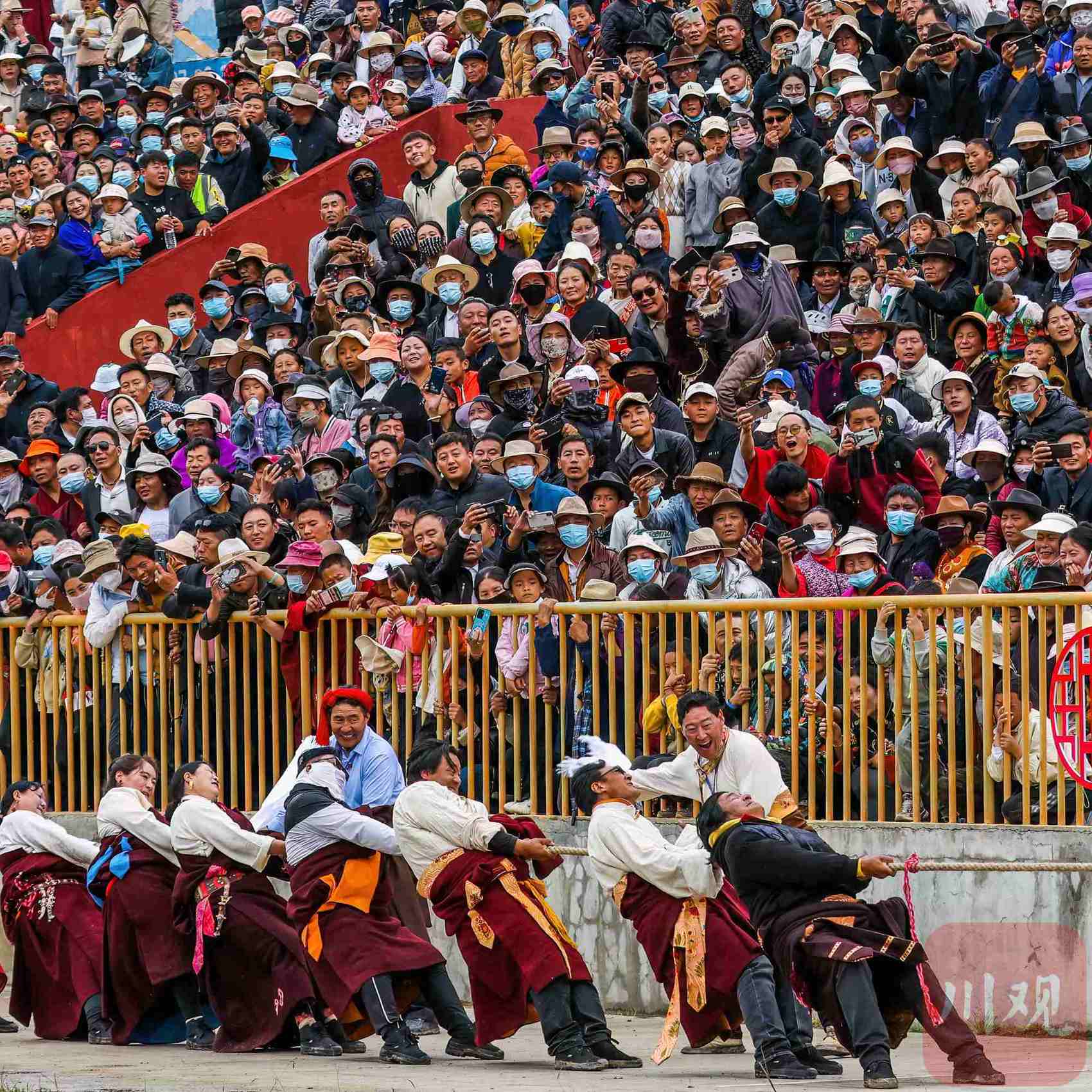 青海玉树传统赛马节的拔河比赛中,选手们一鼓作气的劲头与观众的加油声,响彻运动场。