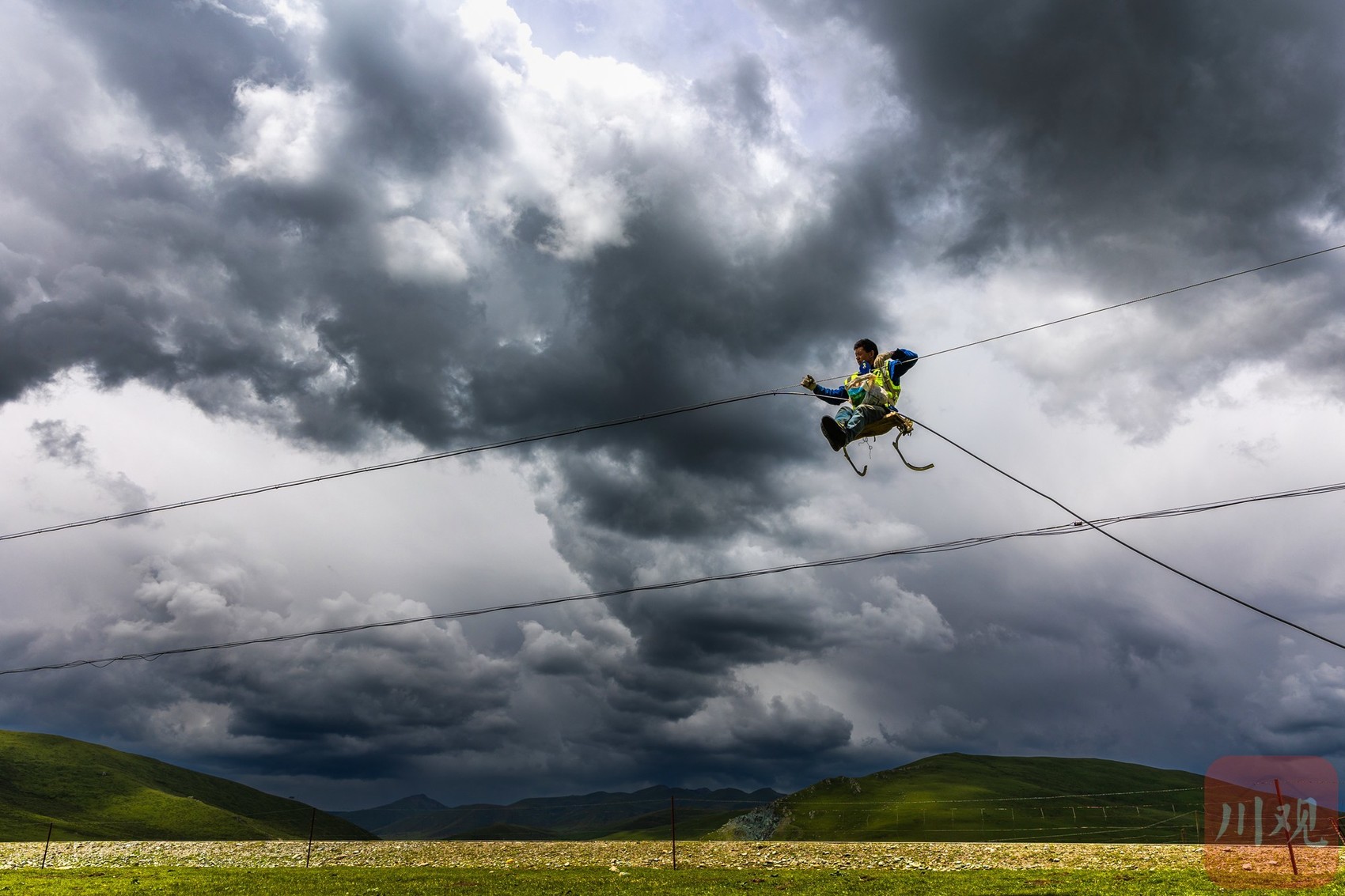 青海省果洛州久治县智青松多镇日阿沃塘,移动阿坝公司工作人员正在进行高空电话线路架设作业。