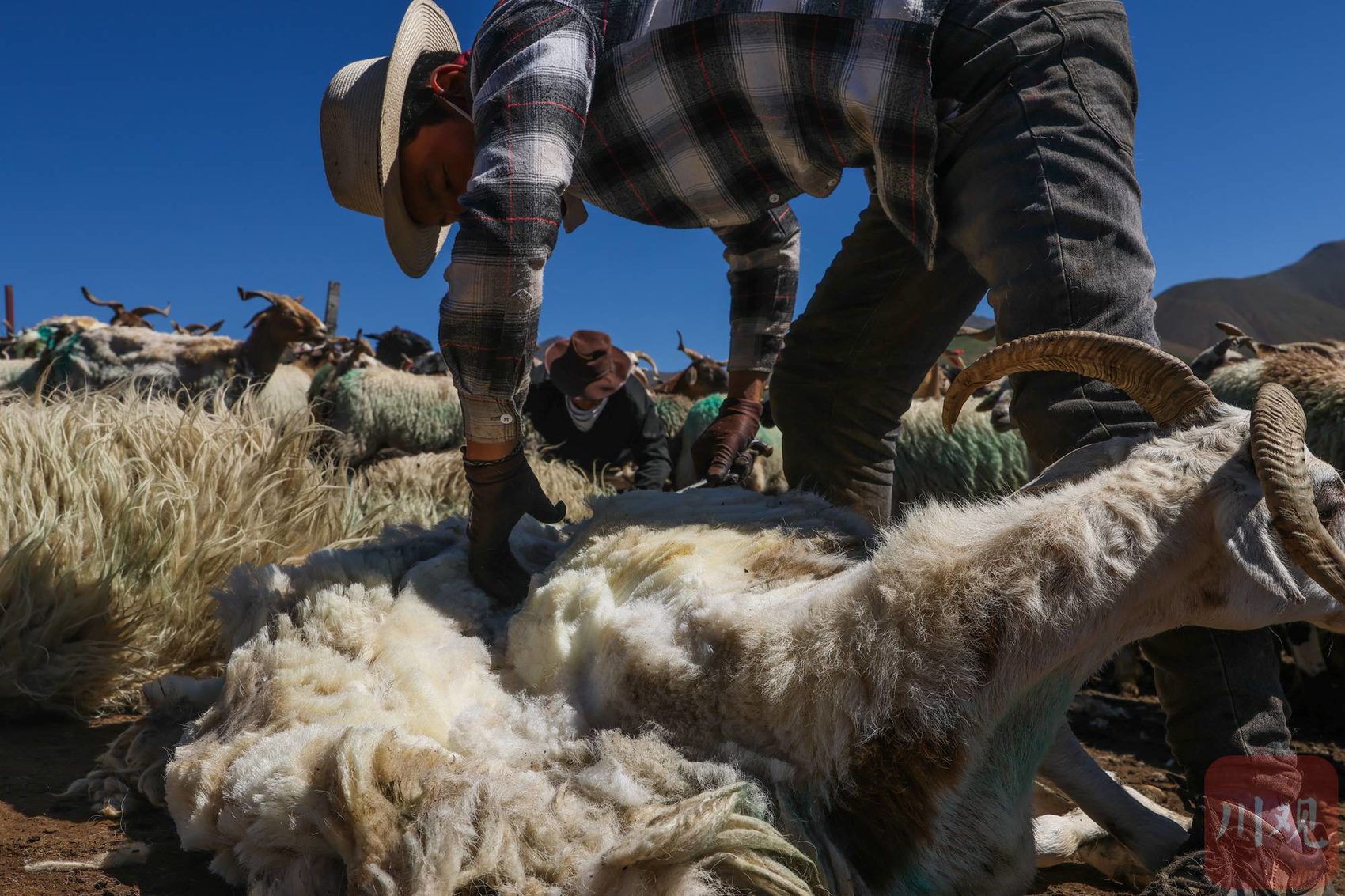 门源县苏吉滩乡药草梁村,安多村民集体出动,进行一年一度的剪羊毛劳作。