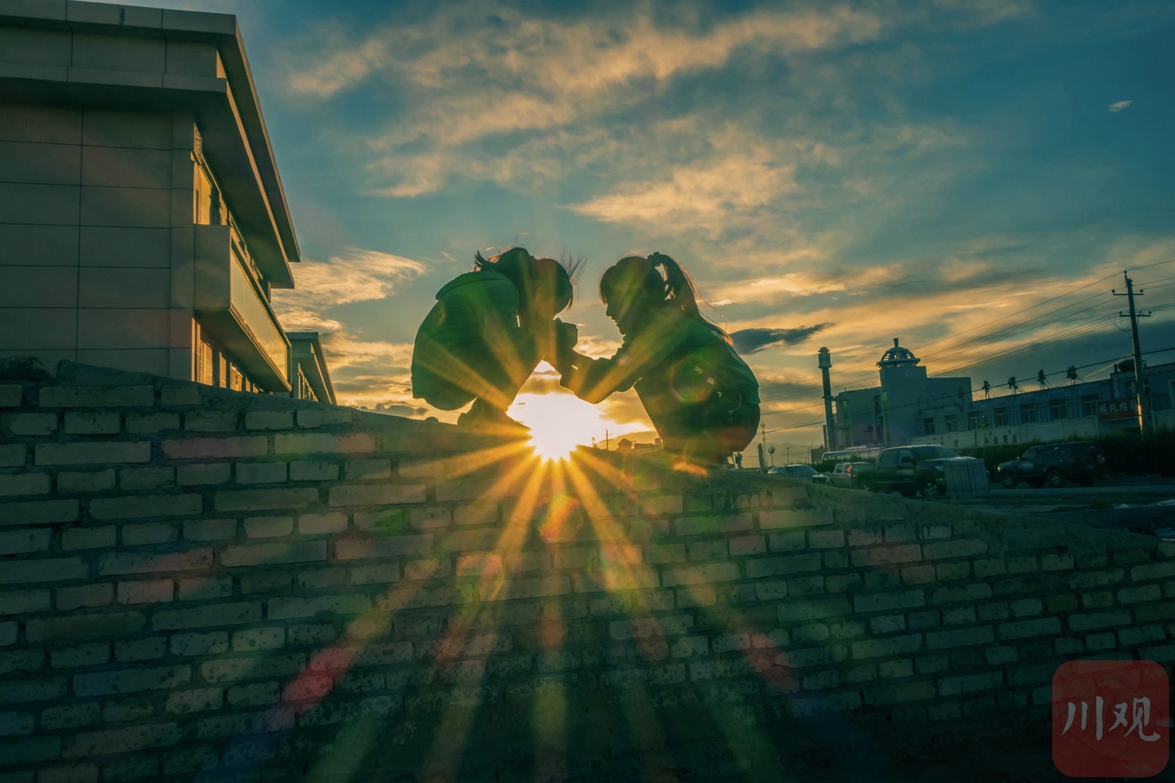 青海西宁街头,夕阳下,两个小女孩儿在墙头玩耍。