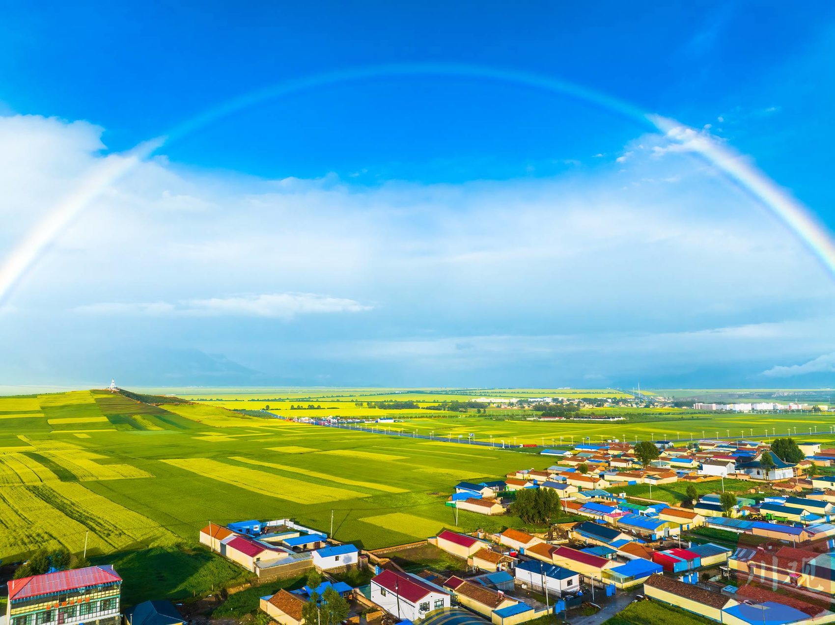 青海门源县青石咀镇红牙合村,油菜花铺满田野。雨后彩虹横跨天际,与花海相映。